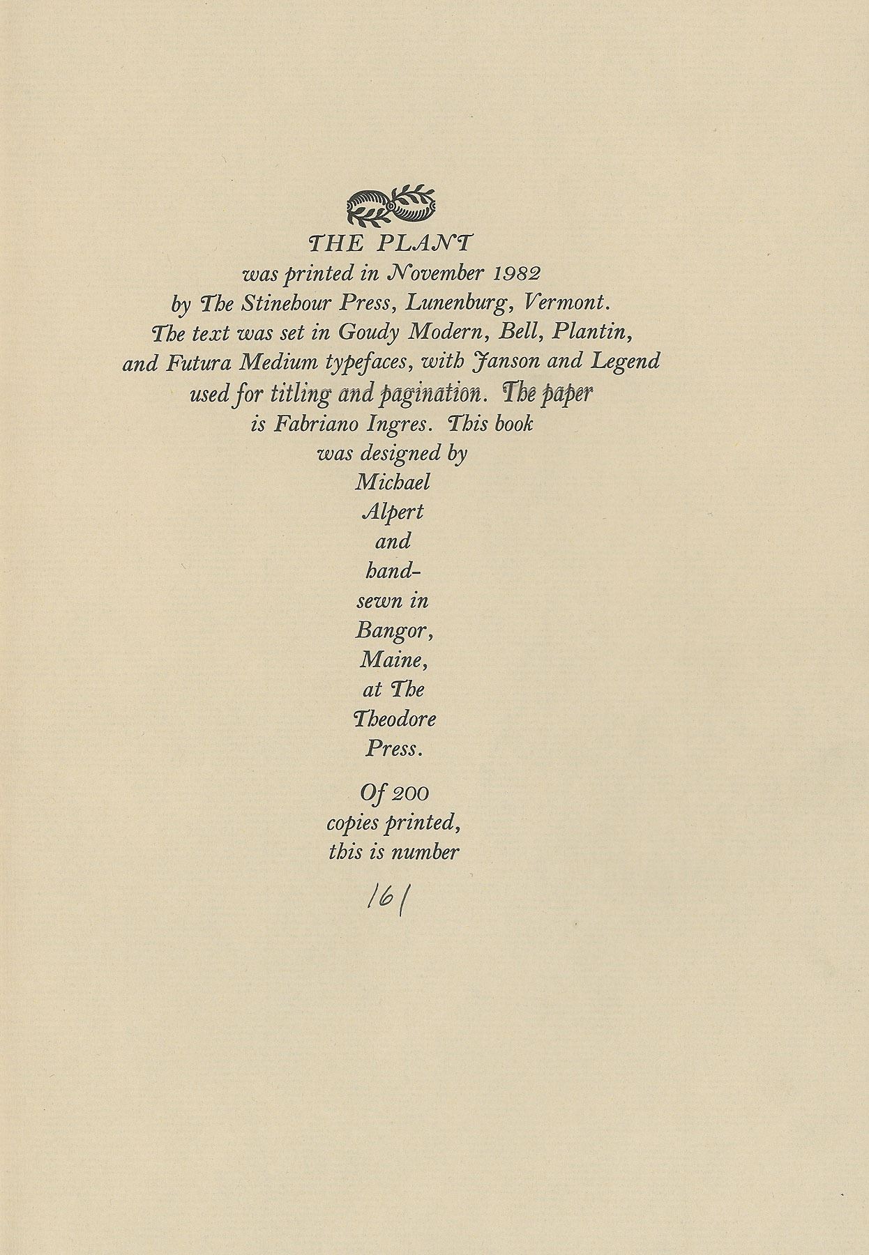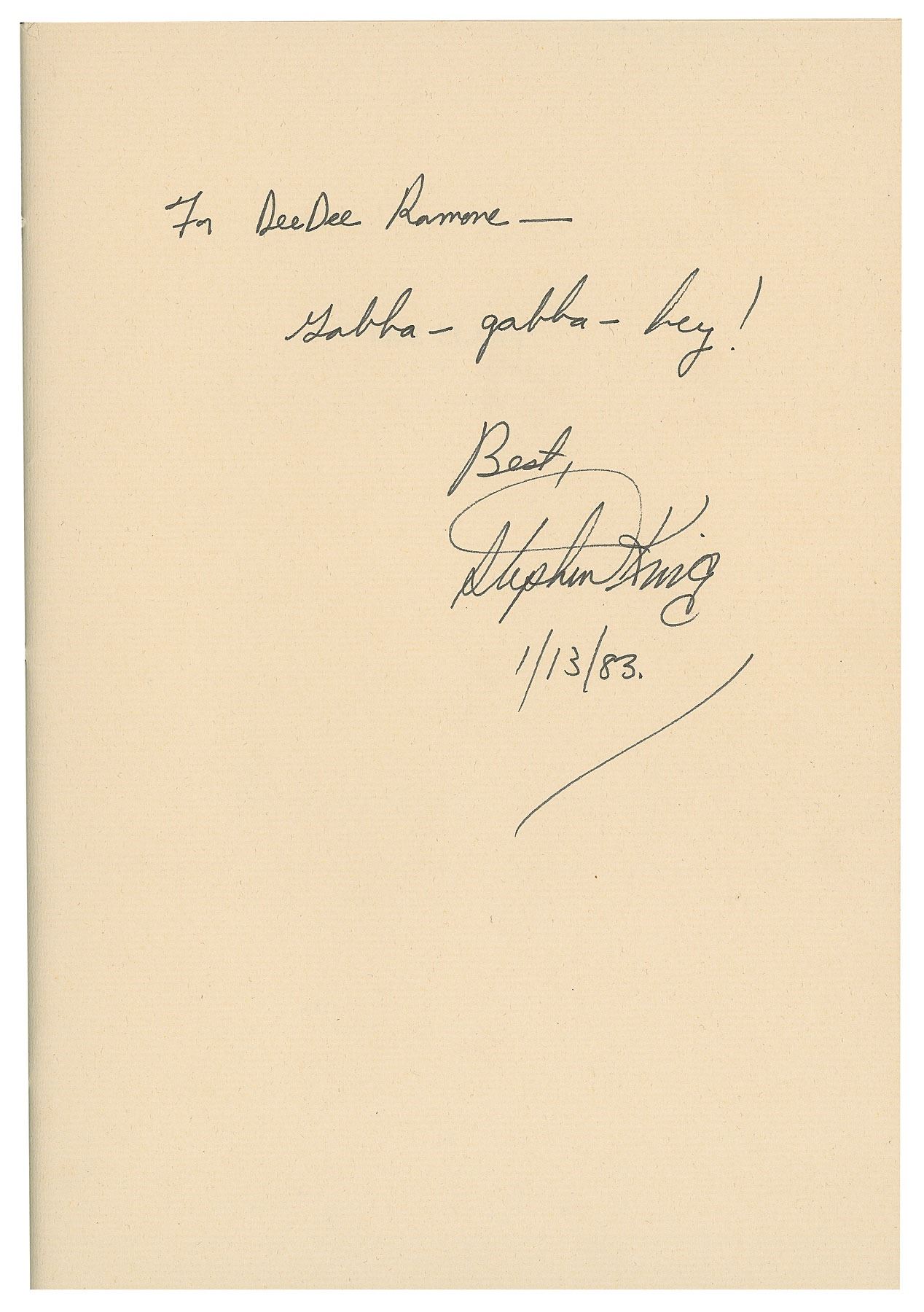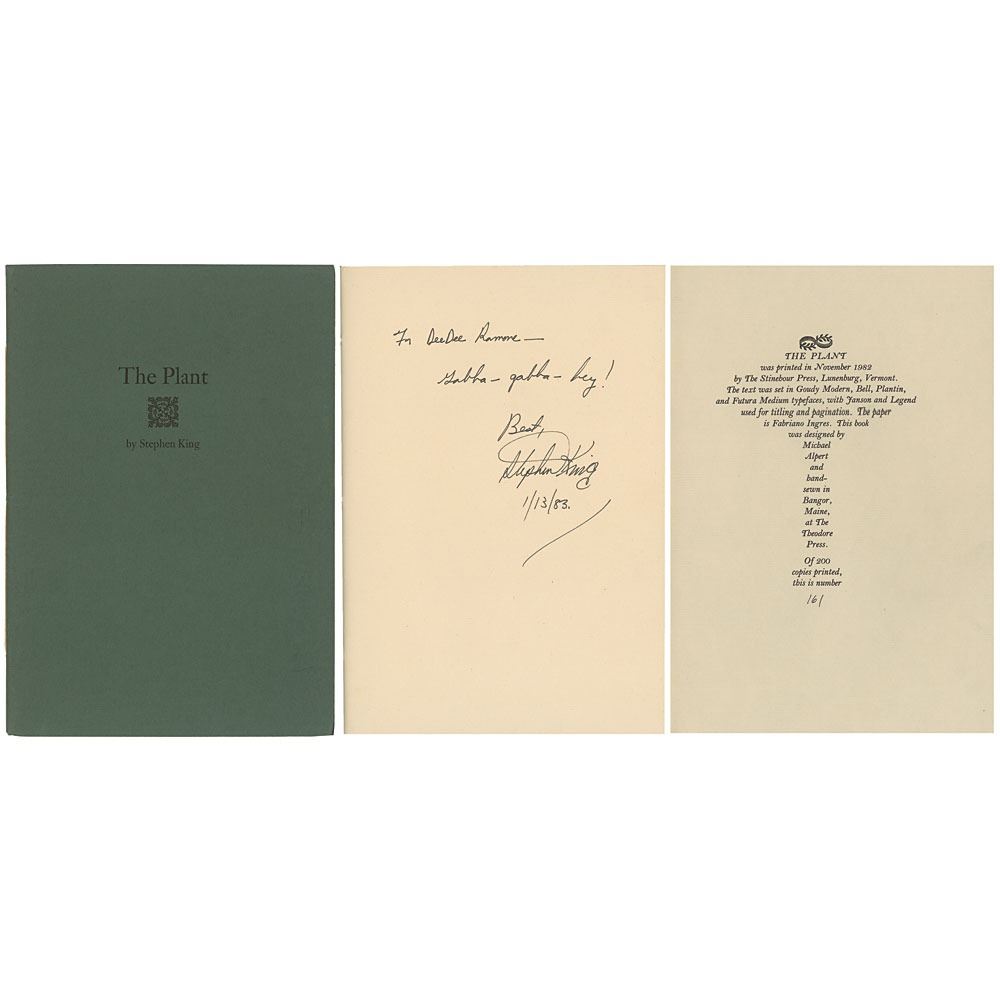 Rare and sought-after signed chapbook: The Plant. First limited edition, numbered 161/200. Bangor, Maine: Philtrum Press, 1982. Softcover, 6.75 x 9.75, 32 pages. Signed and inscribed on the opening flyleaf in black ink, "For Dee Dee Ramone—Gabba–gabba–hey! Best, Stephen King, 1/13/83." In fine condition. King wrote a few parts of The Plant and sent them out as chapbooks to his friends, instead of Christmas cards, in 1982, 1983, and 1985. Philtrum Press produced three installments before the story was shelved, with the original editions now regarded as hugely desirable collector's items. The Ramones, one of King's favorite bands, have been inextricably linked with the author since the band wrote the title song for the 1989 film Pet Sematary, with 'Sheena Is a Punk Rocker' also heard during the film. Additionally, King's 1983 novel for Pet Sematary makes reference to the punk rockers near the end of Chapter 11—'Louis turned on the radio and dialed until he found the Ramones belting out 'Rockaway Beach.' He turned it up and sang along—not well but with lusty enjoyment.' A fantastic union of punk rock and horror royalty. From the personal collection of Vera Ramone King.