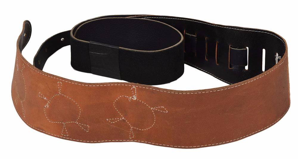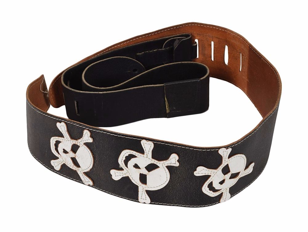 Amazing black leather Earth III bass strap personally–owned and –worn by Dee Dee Ramone. The strong leather strap measures 44.5? in length and features three white leather skulls stitched to lower portion; adjustment belt bears a section of black duct tape. In fine condition, with mild expected wear from use. This was displayed as part of the “Hey! Ho! Let’s Go: Ramones and the Birth of Punk” exhibit at the Queens Museum in New York from April 10, 2016–July 31, 2016, and the Grammy Museum at L.A. Live from September 16, 2016–February 28, 2017. From the Monte A. Melnick Ramones Collection.