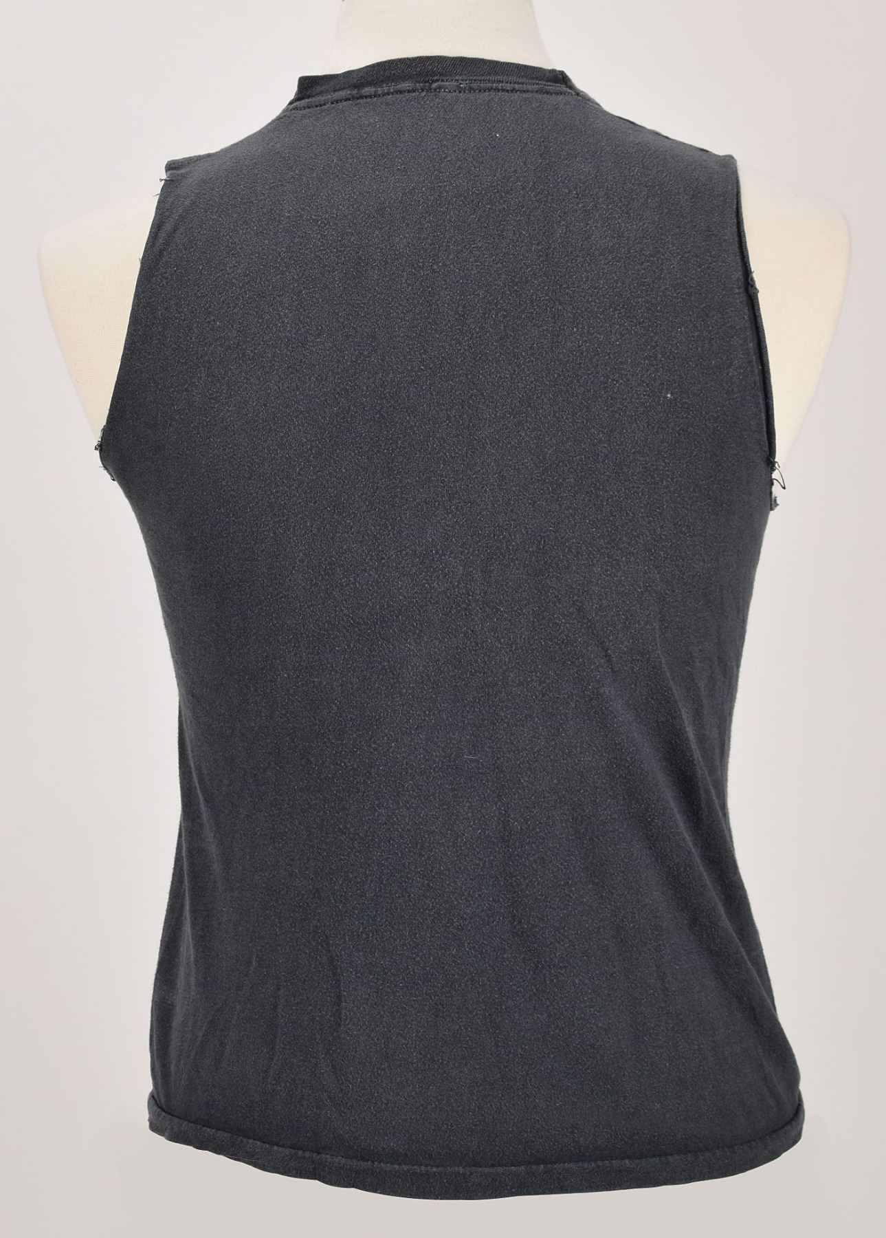 Faded black Ramones t-shirt with cut off sleeves, personally-owned and -worn by Dee Dee Ramone, the original and longtime bass-player for punk rock legends The Ramones. The shirt, likely size small or medium, features the cover art for the band's sixth studio album, Pleasant Dreams. In fine condition, with expected wear. From the personal collection of Vera Ramone King.