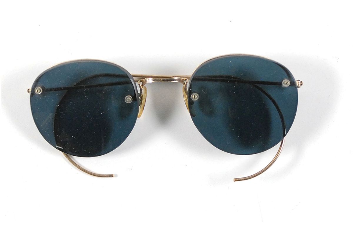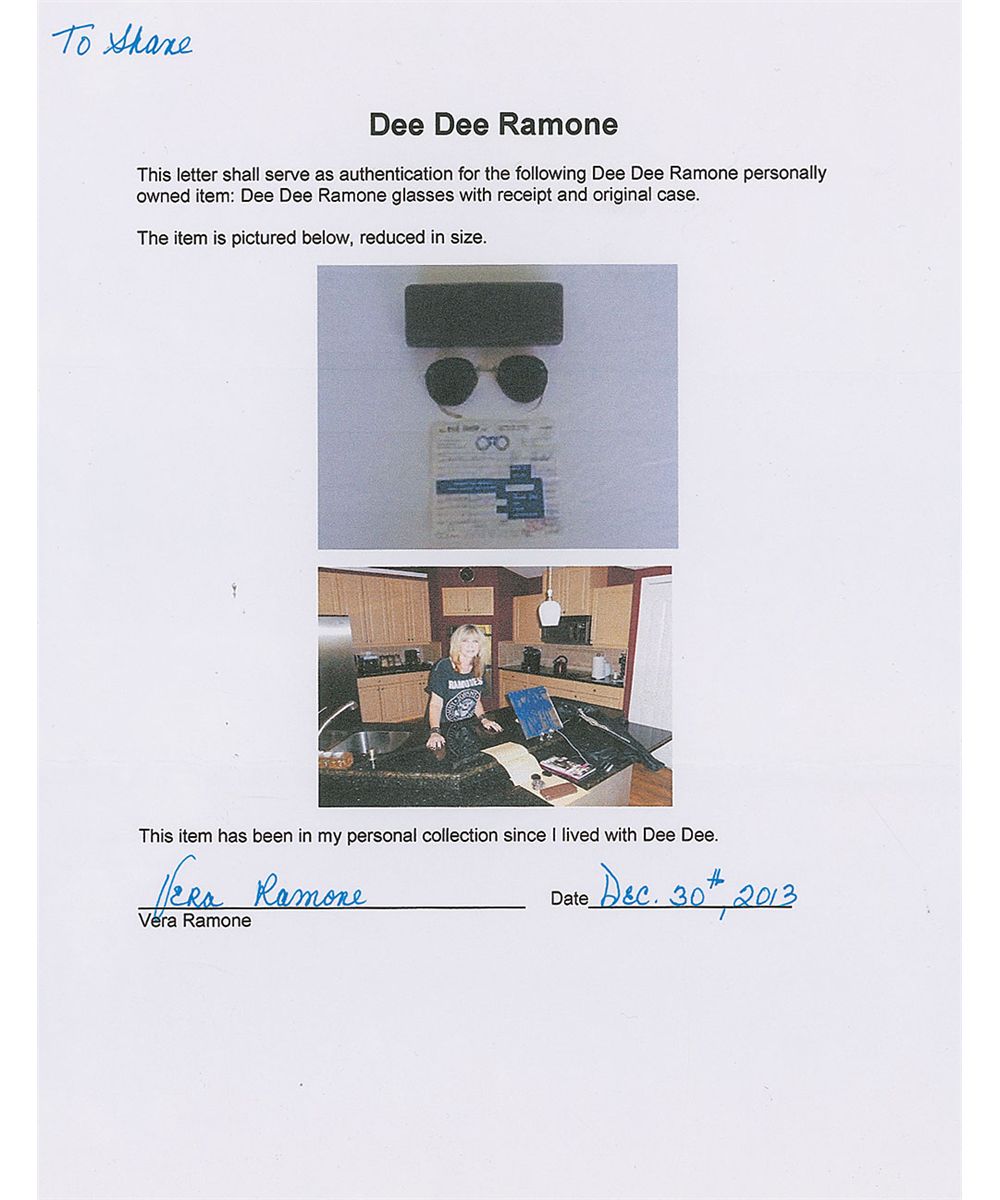 Dee Dee Ramone’s personally-owned and stage-worn sunglasses. Wire framed black tinted glasses have Art Craft USA stamped on the inside of both temples and plastic prescription frames. Glasses are accompanied by their original case and purchase receipt, issued to Douglas Colvin on September 16, 1988. In fine condition. Accompanied by a letter of authenticity from Ramone’s first wife Vera. Few stage-worn items from any member of the band are available to the public, as they are highly coveted.