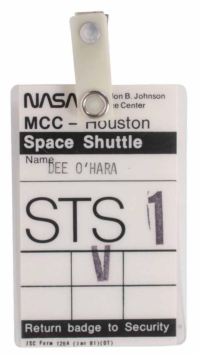 First NASA nurse (born 1935) who served from the Gemini program to the Apollo-Soyuz collaborative project. Dee O’Hara’s laminated Space Shuttle badge for the NASA Manned Spacecraft Center, Mission Control Center-Houston, 2.5 x 3.75, stamped with her name, “Dee O’Hara,” noting the mission as STS “1,” with “V” stamped below. In fine condition.
