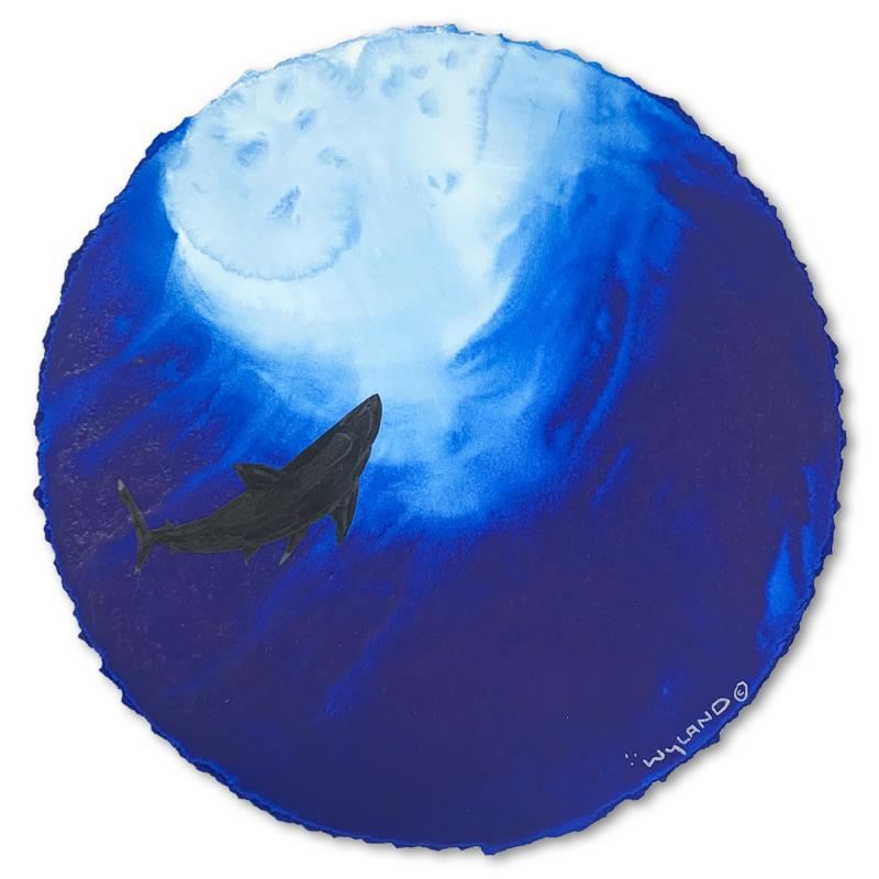 "Deep Blue Shark" is an original painting, watercolor on deckle edge paper by Wyland. Hand signed by the artist, the piece comes custom framed and with a letter of authenticity. Measures approximately 30" x 30" (framed), 19.5" x 19.5" (image).
