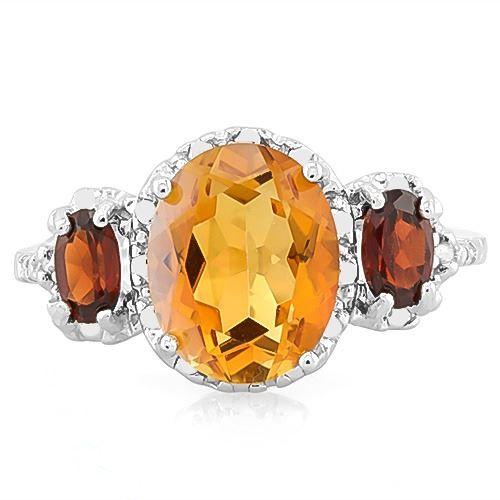 Beautiful deep yellow/orange 2.6CT oval cut Citrine gemstone ring with 1.3CTW oval cut Garnet gemstone accents set in Platinum over Sterling Silver. Ring is styled to mimic micro-pave halo and on shank, for a gorgeous, vintage look. Size 7. 3.1g
