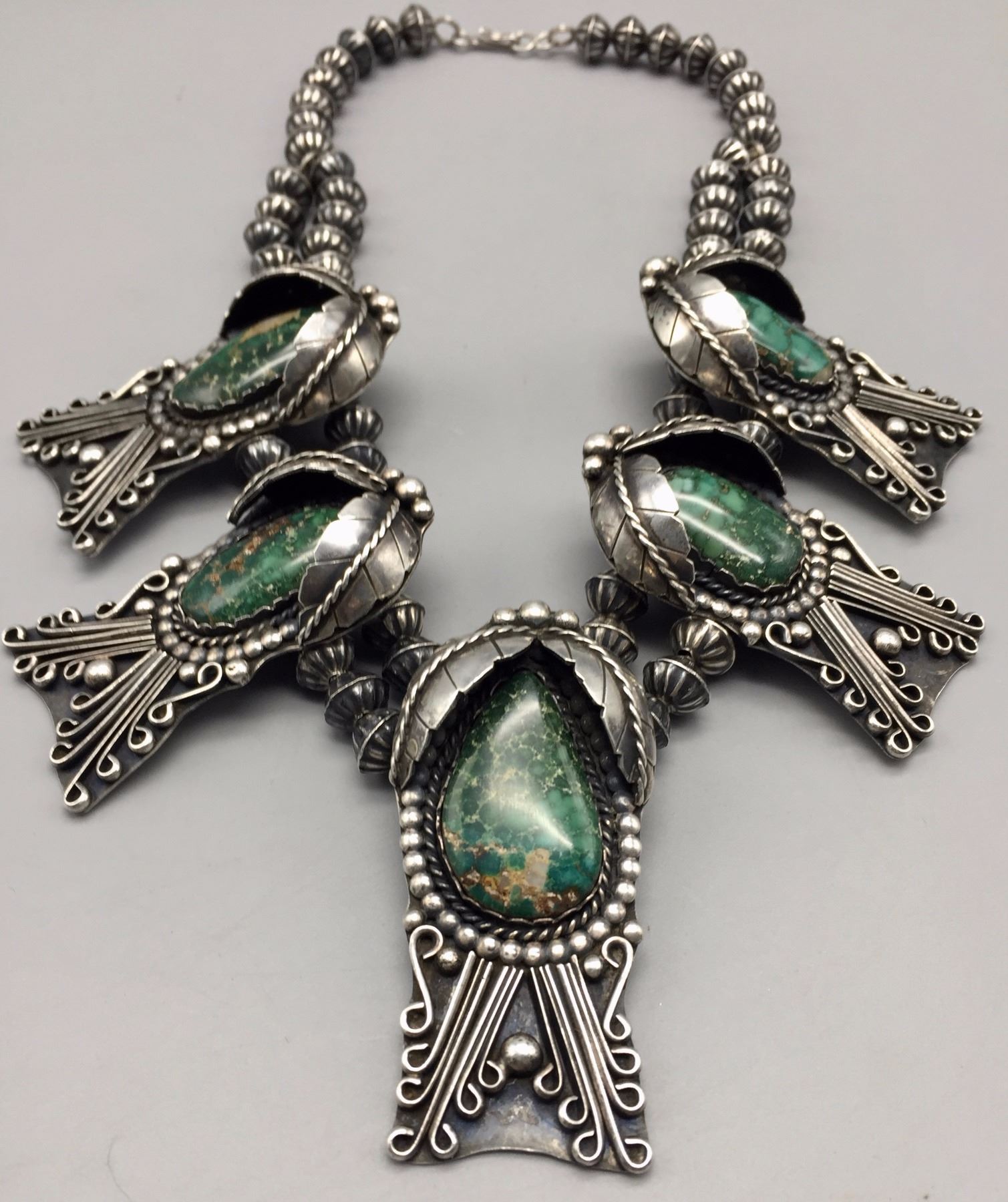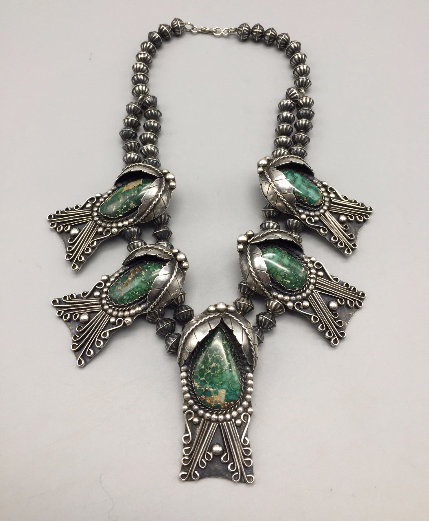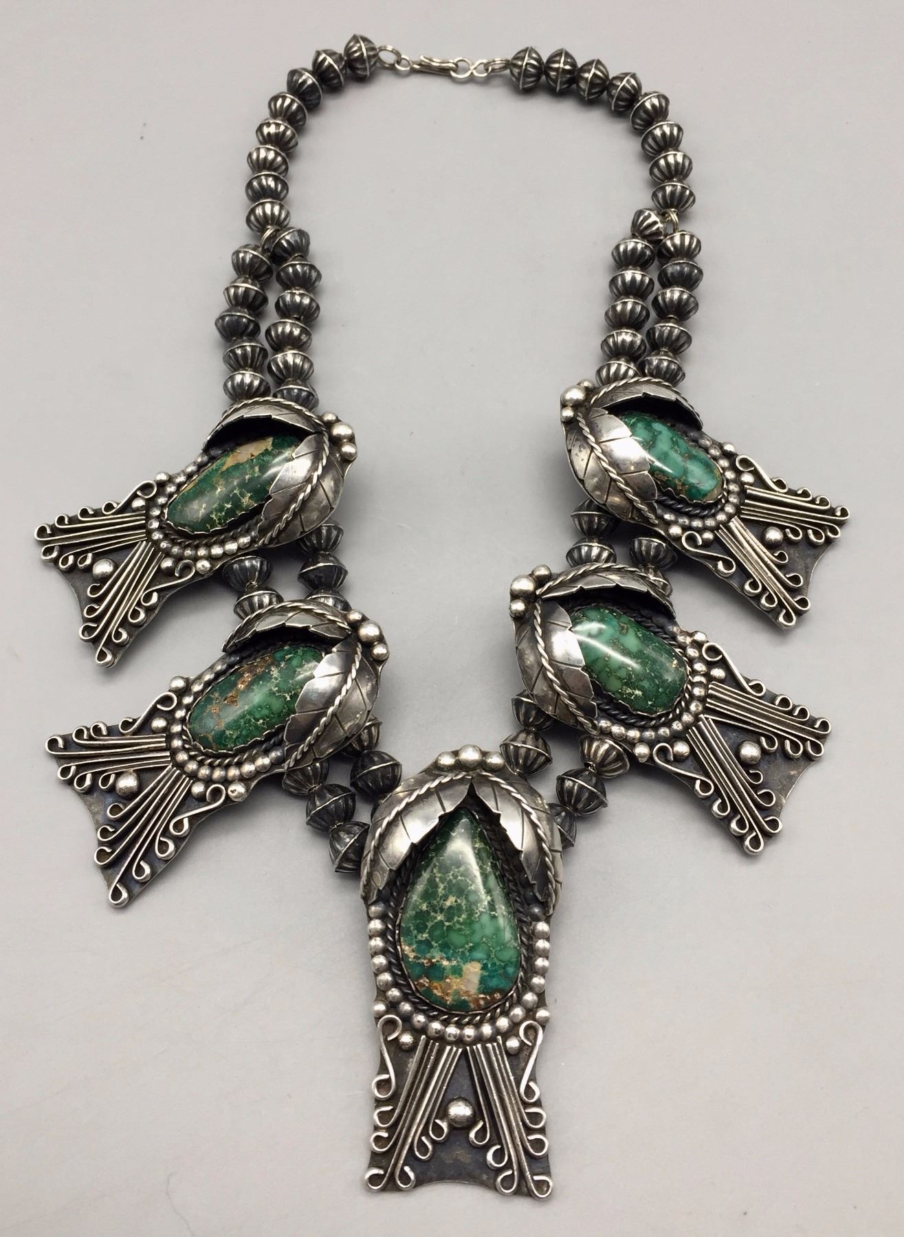 Maker: Unmarked, Approx. Age: Circa 1970s. Size: Fits 15” around the neck, and weighs 168.7 g Additional Info: 5 deep green turquoise cabochons set in sterling silver necklace. Condition: Good, normal wear expected. Please look closely at the pictures - they are an important part of our description. Shipping: There will be a $5 handling / packaging fee for shipping this lot. The actual cost of postage will be added on top of that.