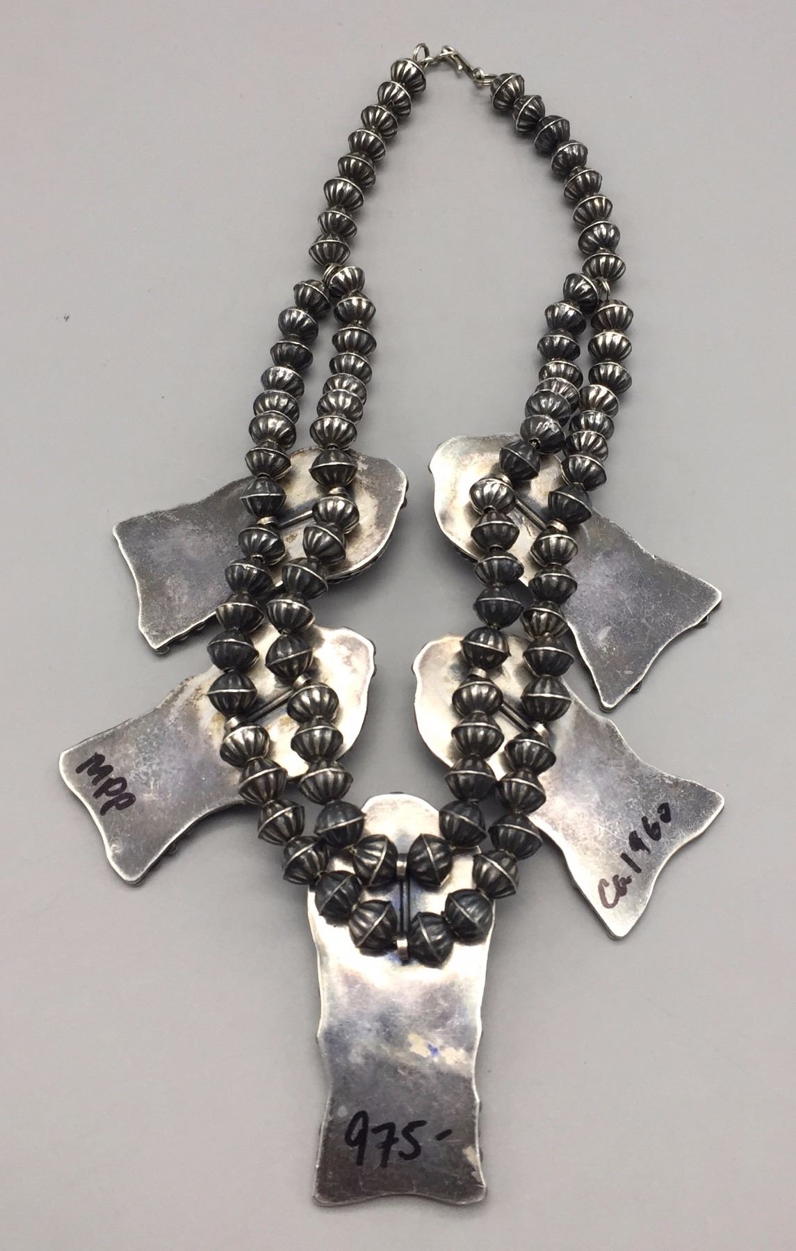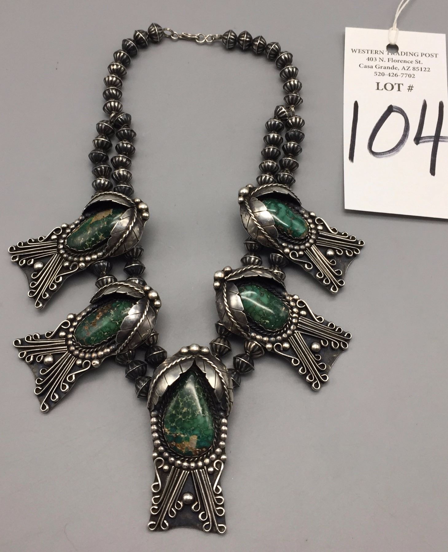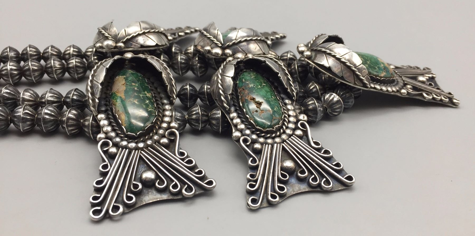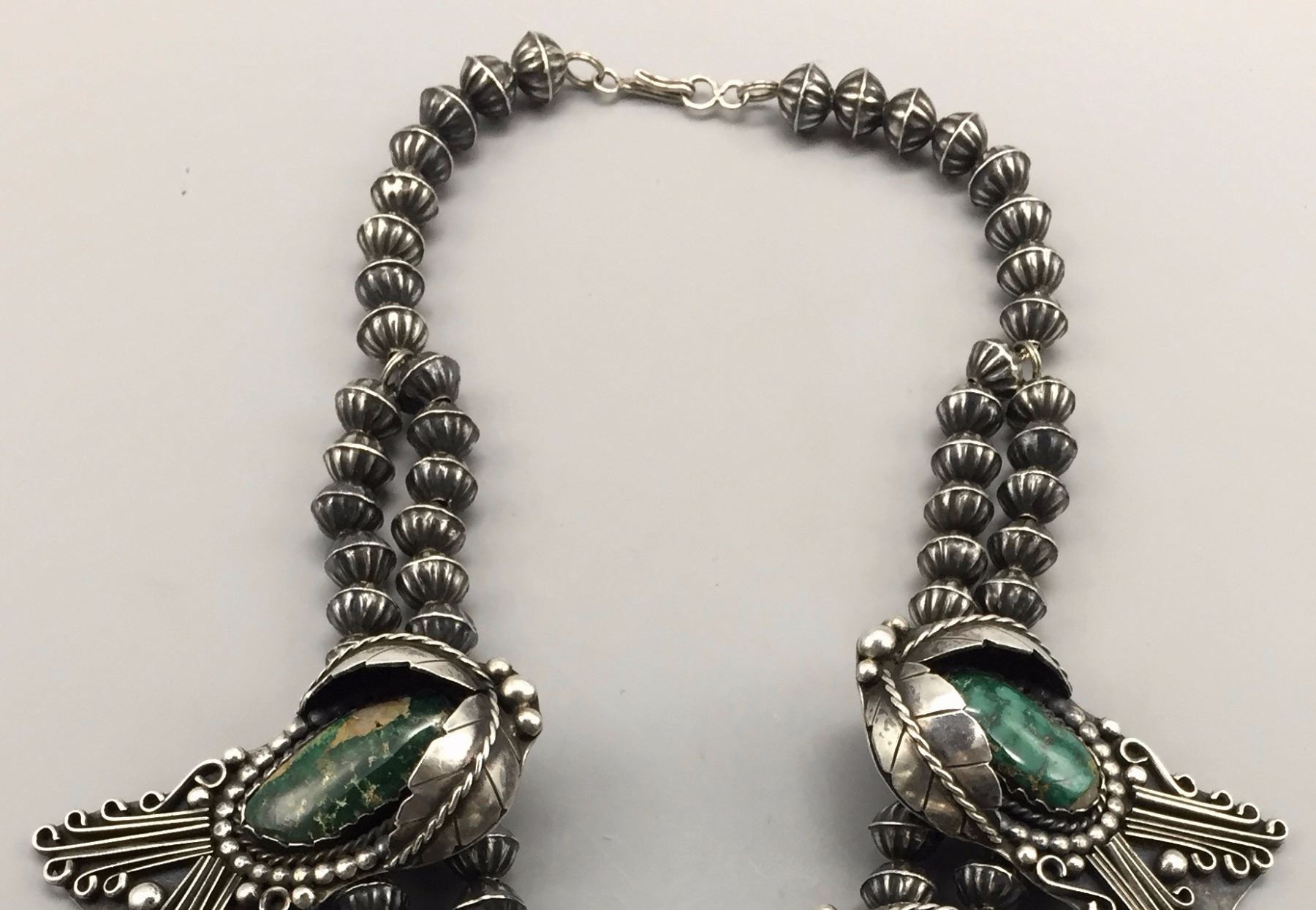Maker: Unmarked, Approx. Age: Circa 1970s. Size: Fits 15” around the neck, and weighs 168.7 g Additional Info: 5 deep green turquoise cabochons set in sterling silver necklace. Condition: Good, normal wear expected. Please look closely at the pictures - they are an important part of our description. Shipping: There will be a $5 handling / packaging fee for shipping this lot. The actual cost of postage will be added on top of that.