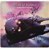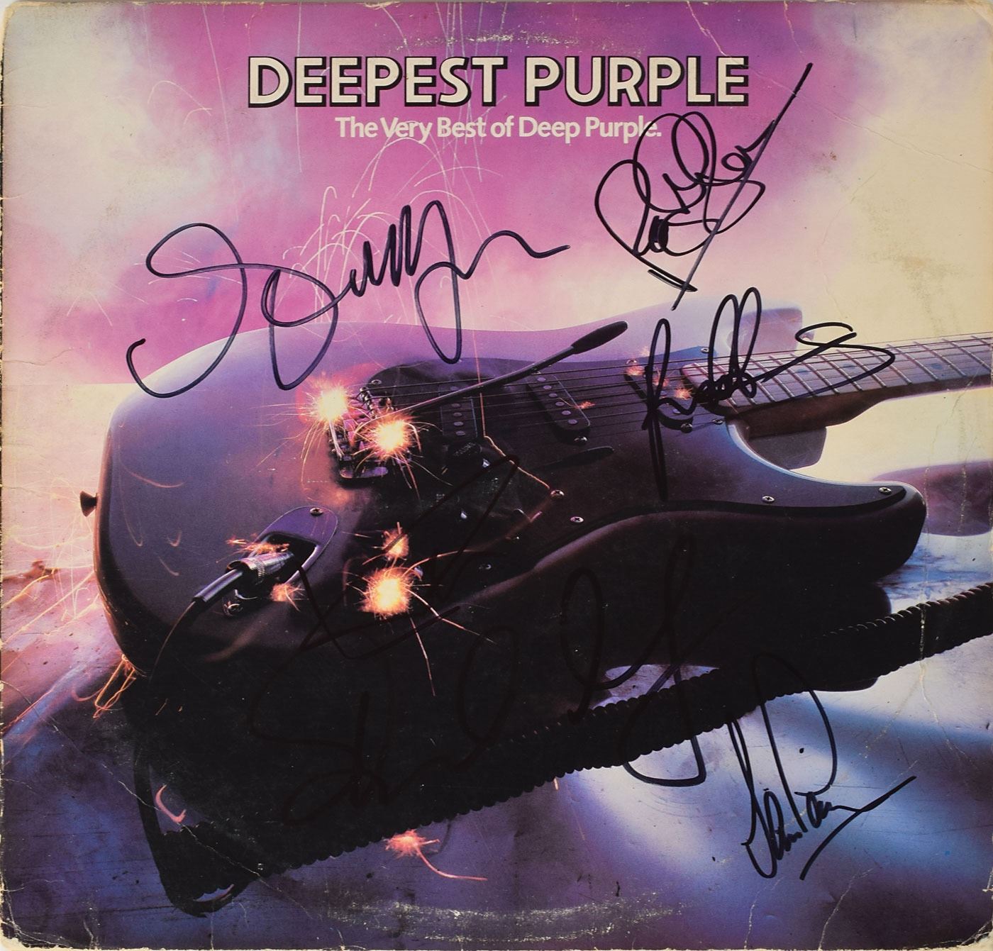 Deepest Purple: The Very Best of Deep Purple album signed on the front in black felt tip by Ritchie Blackmore, Ian Gillan, Glenn Hughes, David Coverdale, Roger Glover, and Ian Paice. In very good condition, with creasing, light contrast to some of the signatures against the darker background, light ‘rings of wear,’ and tape to reverse edges. The record is included. Accompanied by a full letter of authenticity from REAL.