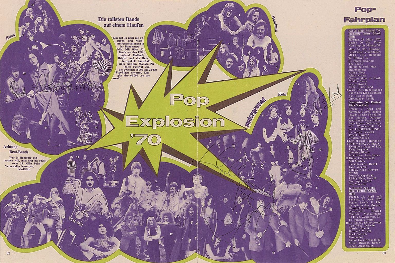 Highly appealing vintage color 16.25 x 10.75 German magazine centerfold promoting "Pop Explosion '70," showing images and a timetable of numerous bands set to tour Germany in 1970, signed in black ballpoint by Ian Gillan, Ian Paice, Jon Lord, Roger Glover, and Ritchie Blackmore. Also signed by session players Eddie Hardin and Pete York. In fine condition.