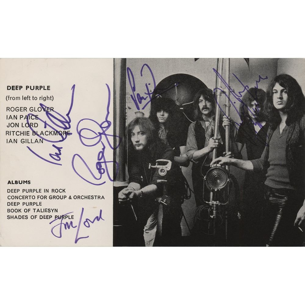 Desirable 7 x 4.5 Deep Purple promo card featuring an image of the band and a listing of their albums, fittingly signed in purple felt tip by Roger Glover, Ian Paice, Jon Lord, Ritchie Blackmore, and Ian Gillan. In very fine condition.