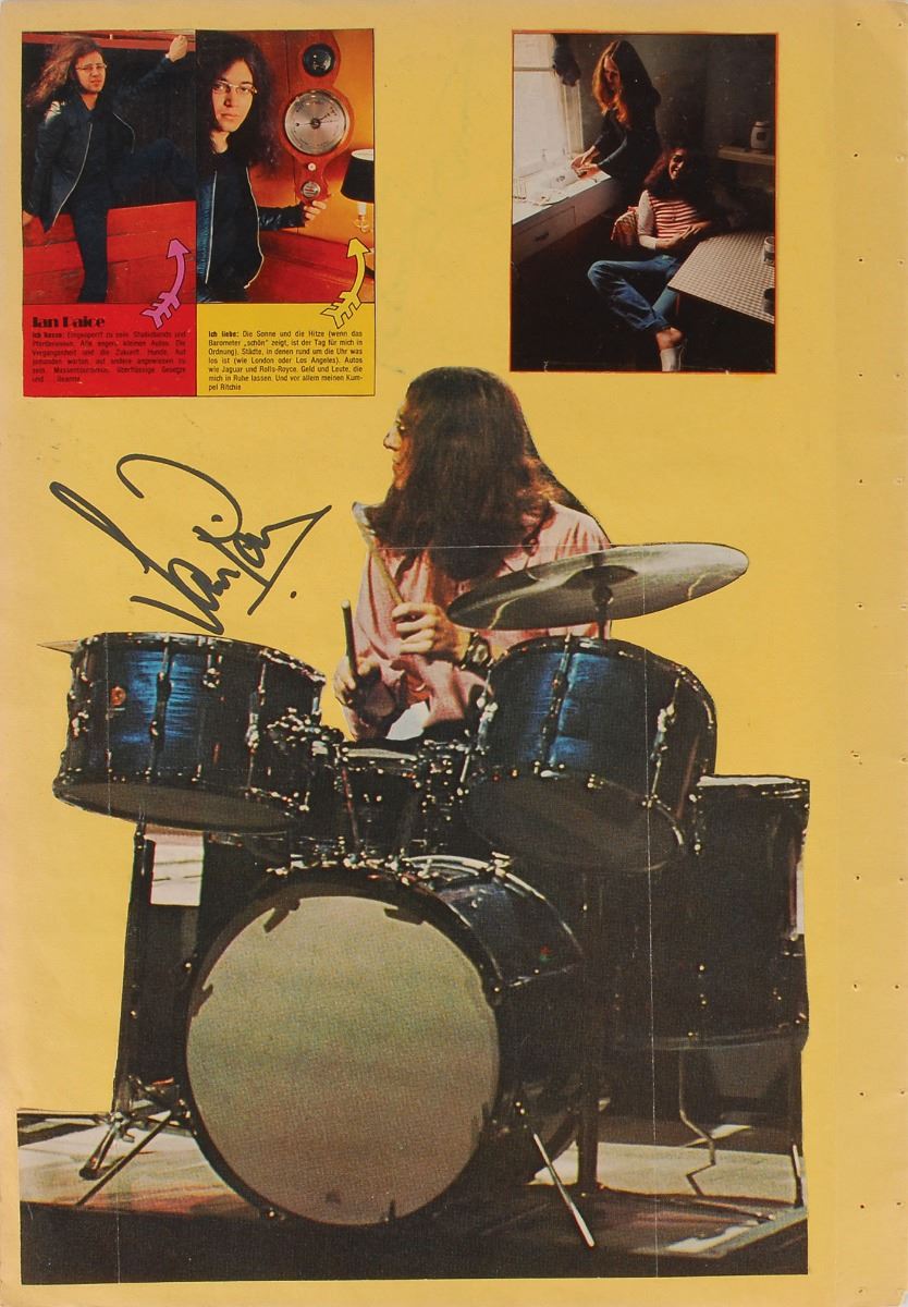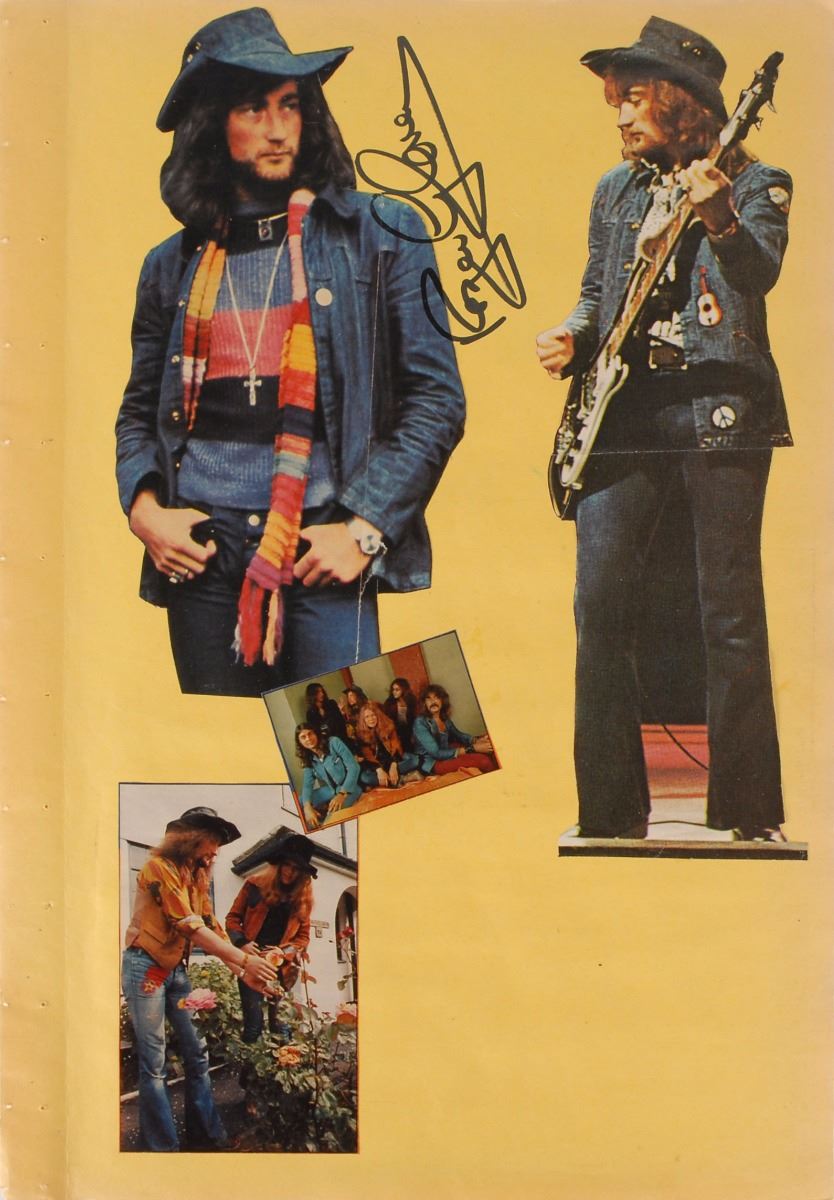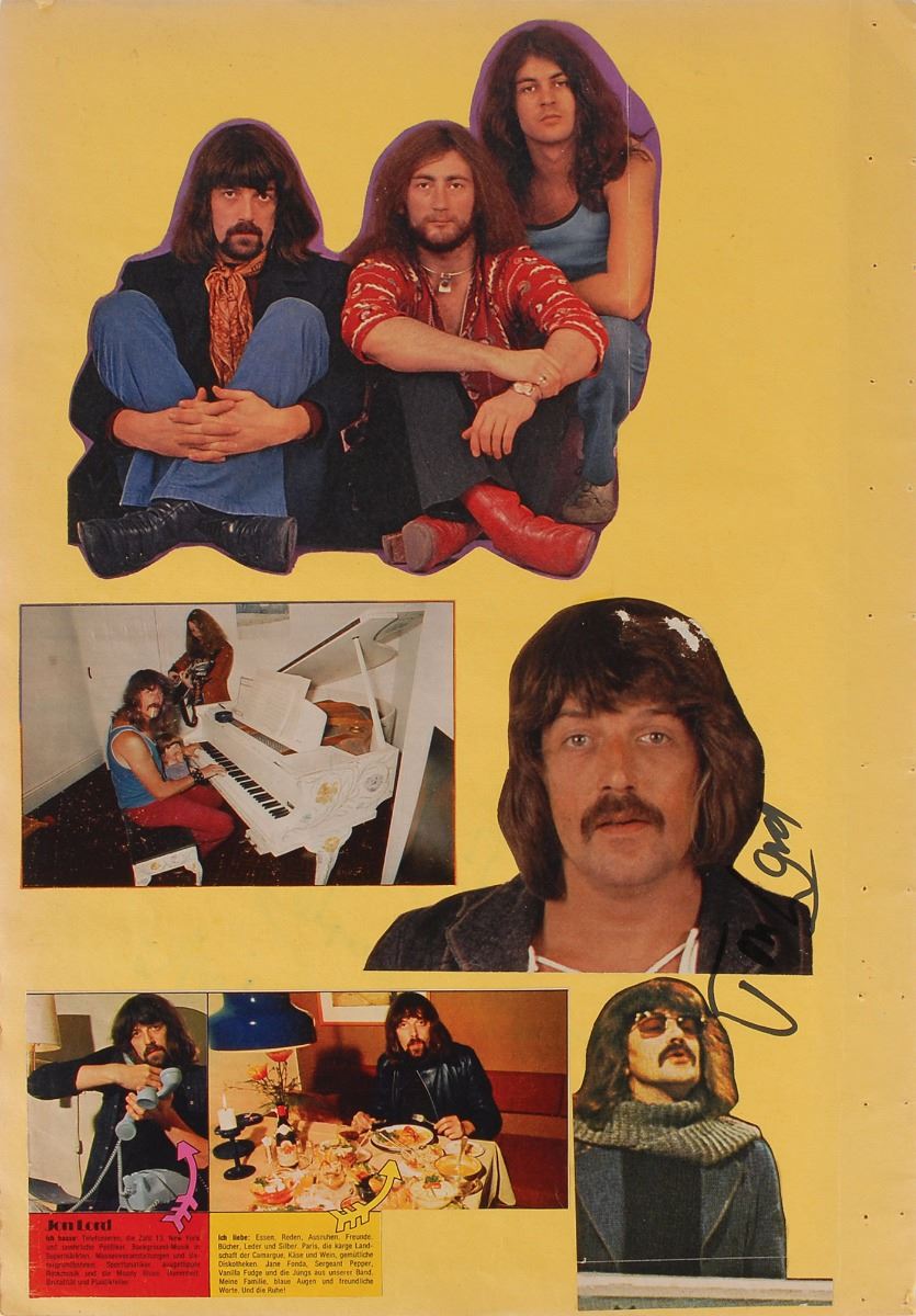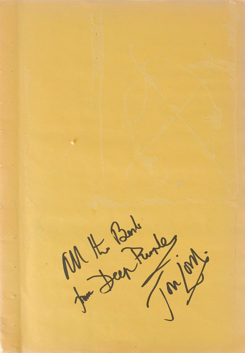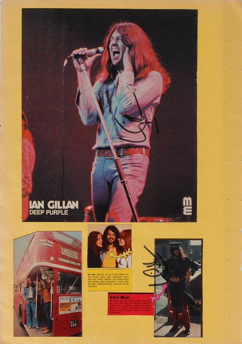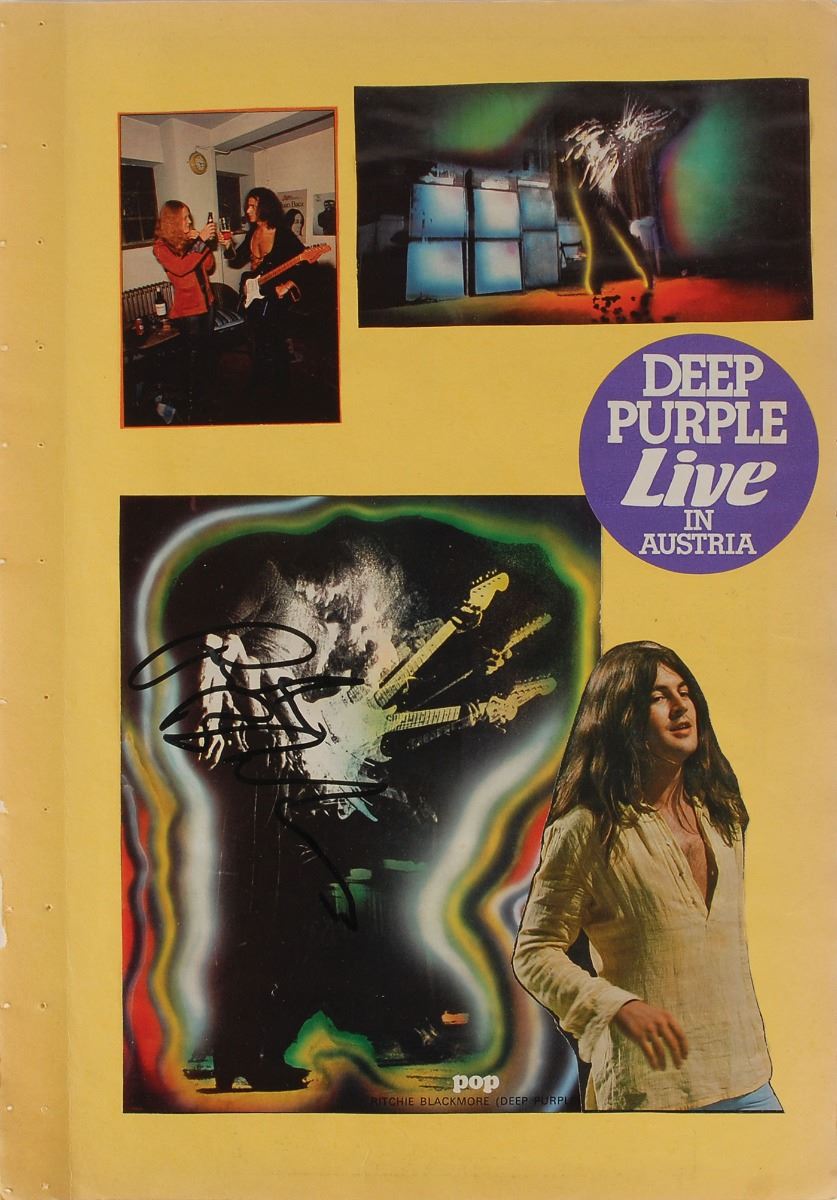 Three yellow scrapbook pages, each approximately 13.75 x 19.75, bearing affixed images of members of Deep Purple to the front and back. One page is signed on the front and back in black felt tip by Jon Lord, who adds to one side, “All the Best, Deep Purple”; the second page is individually signed on the front and back in black felt tip by Ian Paice and Roger Glover; and the third page is individually signed on the front and back in black felt tip by Ritchie Blackmore and Ian Gillan. In overall fine condition. Consignor notes that these vintage signatures were obtained in person in Vienna during the early to mid-1970s.