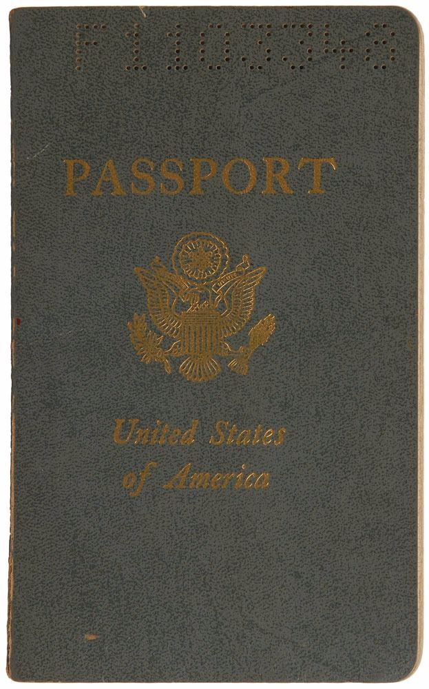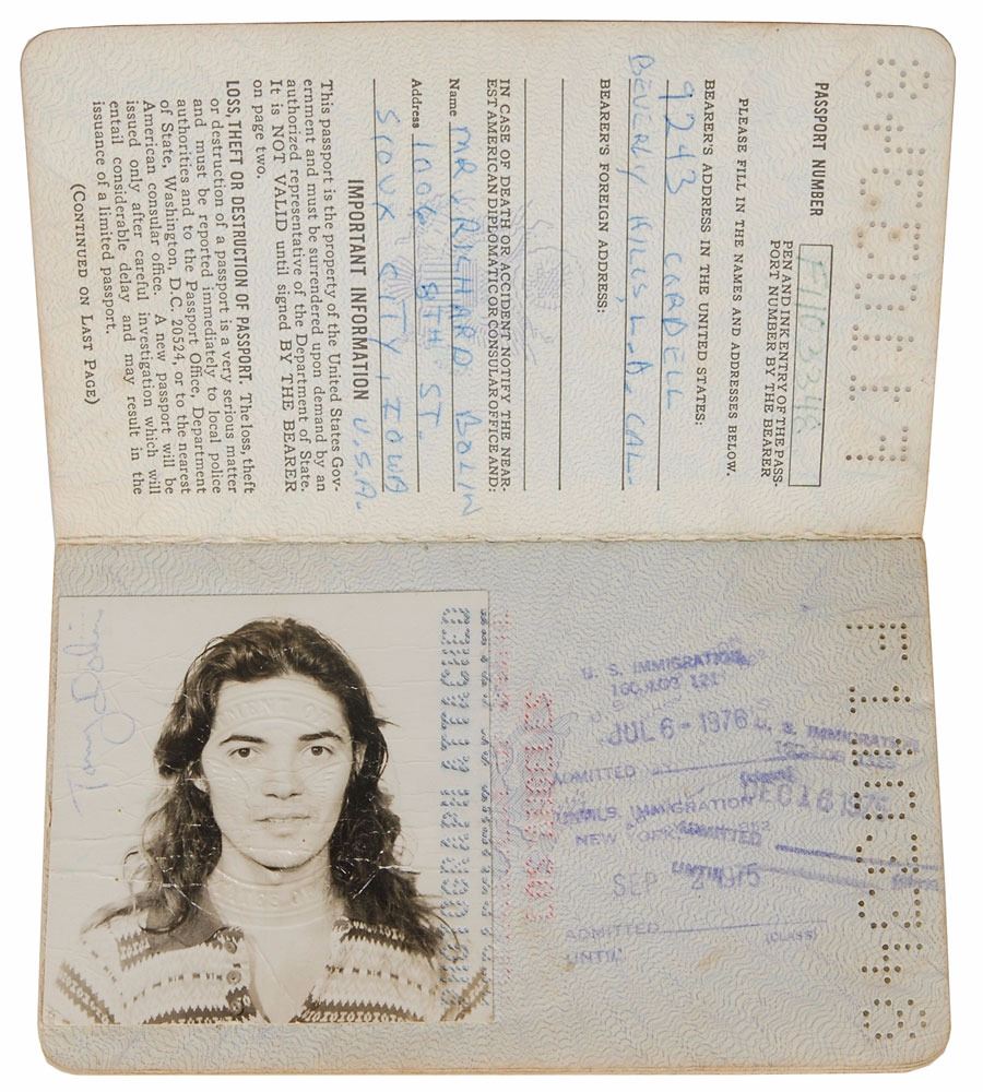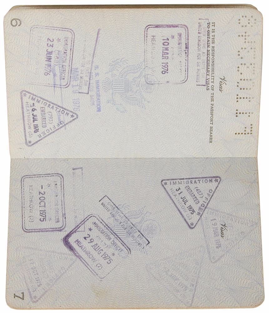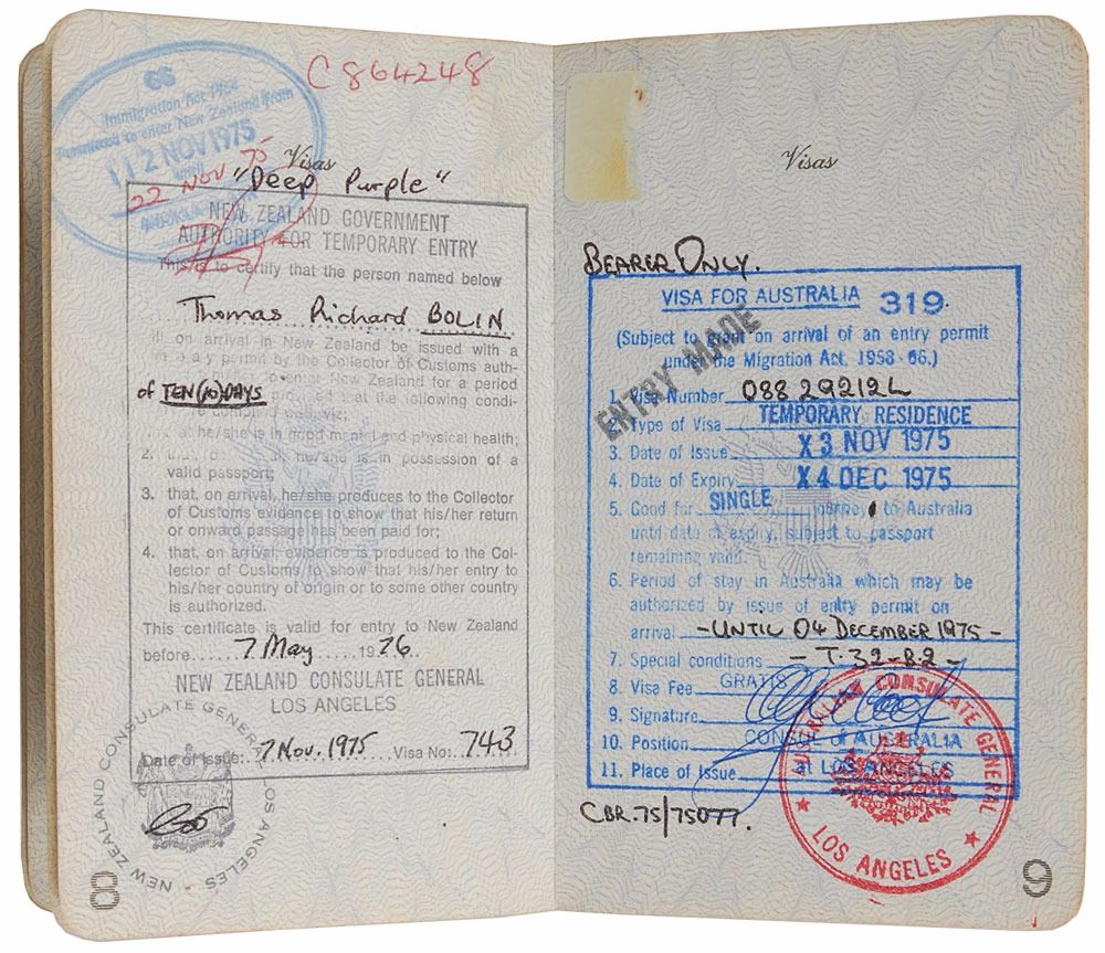Bolin's personal passport, number F1103348, issued circa 1975. Passport measures 3.75 x 6, and contains his personal information on the inside of the front cover, with another hand adding his given name, "Mr. Richard Bolin." Affixed opposite the personal information page is Bolin's 3 x 3 passport snapshot, vertically signed on the left side, "Tommy Bolin." Balance of the pages bear visa stamps from around the world, dated between 1975 and 1976, including those from the United Kingdom, Australia, and New Zealand. In fine condition, with expected wear from use, wrinkling to photo, and adhesive remnants to back cover. Bolin was a member of Deep Purple for less than a year before the band broke up in July of 1976. Not long after releasing his second solo album, Private Eyes, Bolin died from a drug overdose at the age of twenty-five on December 4, 1976. Pre-certified REAL.