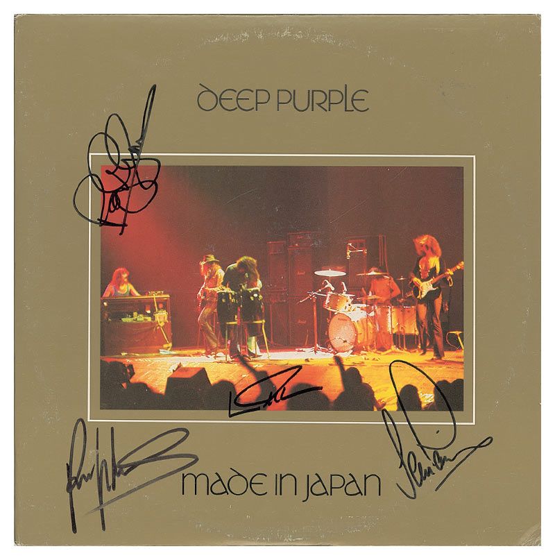 Made in Japan album signed on the front cover in black felt tip by Ritchie Blackmore, Ian Gillan, Ian Paice, and Roger Glover. A few corner creases and a moderate ‘ring of wear’ to covers, otherwise fine condition. The record is included.