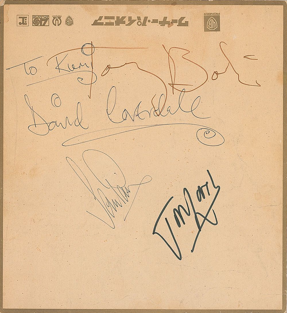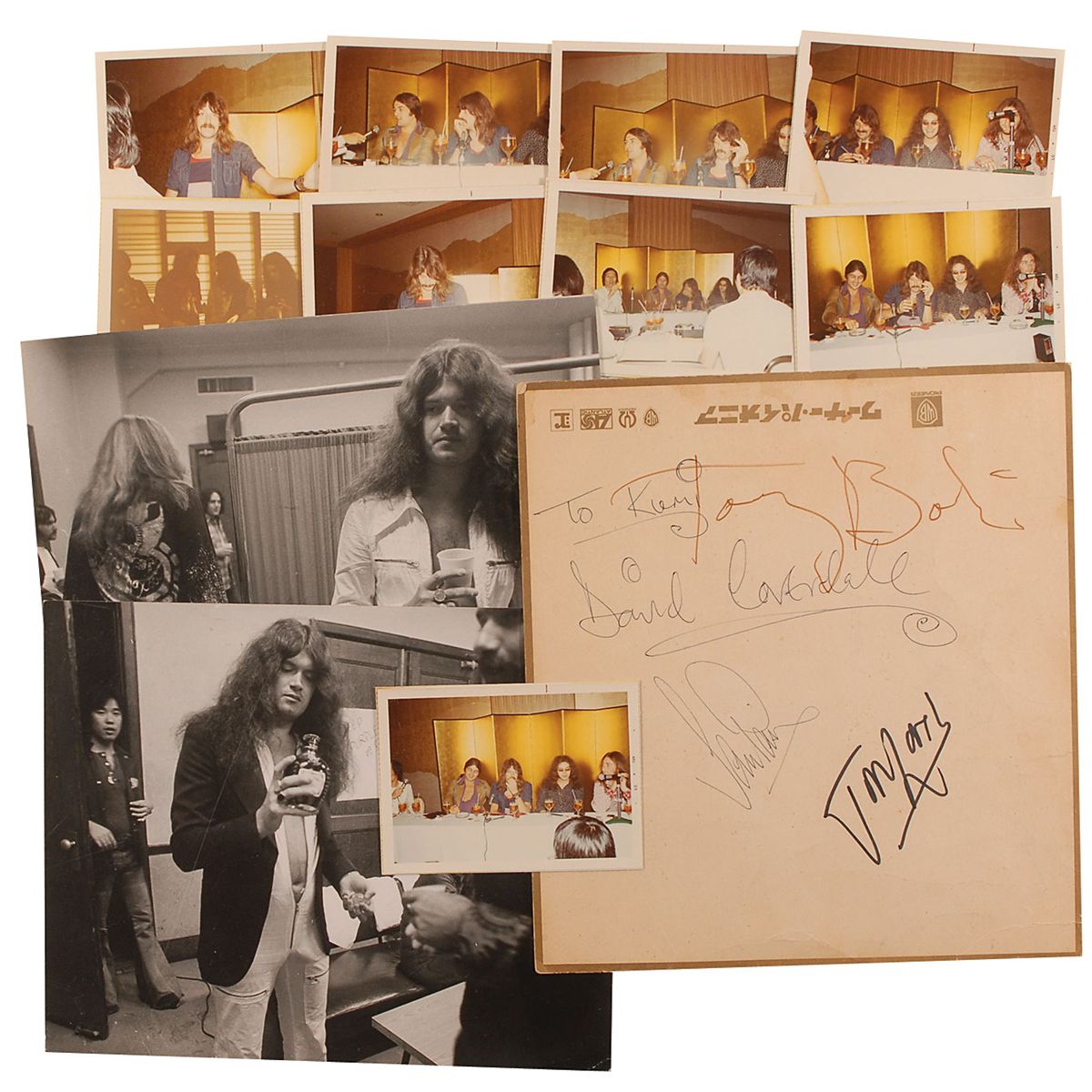 Vintage in-person felt tip and ballpoint signatures, “Tommy Bolin,” “Jon Lord,” “Ian Paice,” and a ballpoint signature and inscription, “To Kumi, David Coverdale,” on an off-white 9.5 x 10.25 Japanese Warner Brothers promotional card. In very good condition, with scattered creases, toning, and soiling. Accompanied by two original glossy 10 x 8 photos from backstage during their Japanese tour, and nine color glossy 4.5 x 3.25 snapshots from a press conference. An extremely scarce set of signatures, as Bolin was only with the group from June 1975 to March 1976; Bolin would die of a drug overdose at the end of 1976, at age 25.
