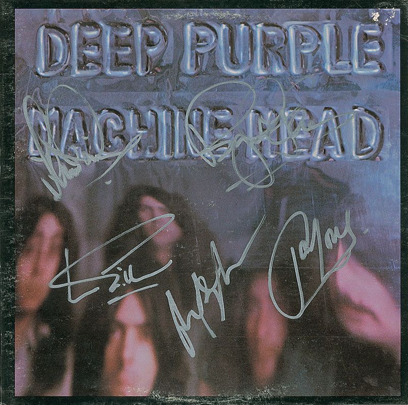 Machine Head album signed on the front cover in silver ink by Ritchie Blackmore, Roger Glover, Jon Lord, Ian Gillian, and Ian Paice. Light wear and rubbing to covers, gatefold stuck together and tape to bottom edge of back cover, otherwise fine condition. The record is not included.