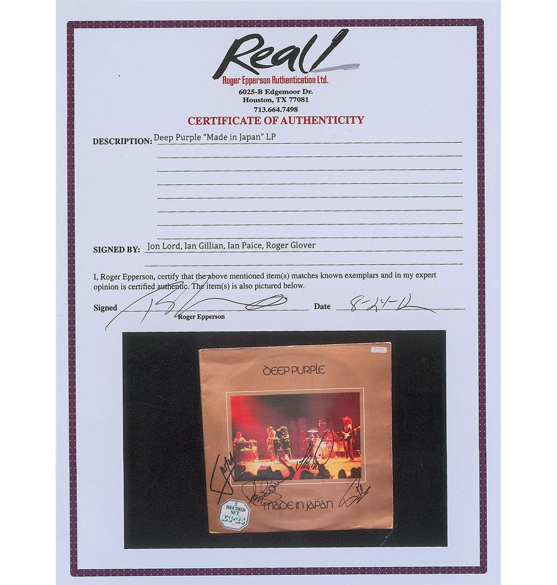 Made in Japan album signed on the front cover in black felt tip by Ian Gillian, Ian Paice, Jon Lord, and Roger Glover. In fine condition, with two labels affixed to front cover, scattered edge wear and creasing, a bit heavier to back cover. The record is not included. Accompanied by a full letter of authenticity from Roger Epperson/REAL.