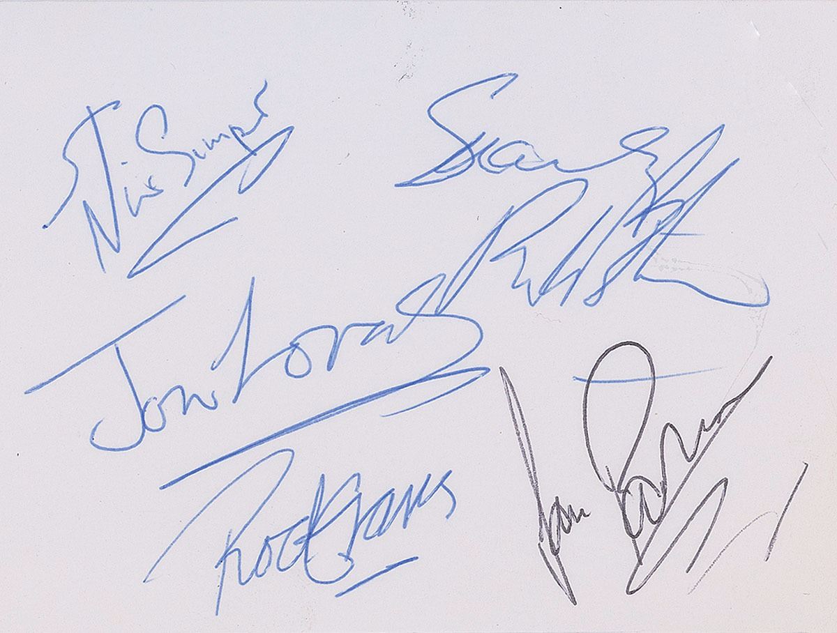 Ballpoint signatures, “Jon Lord,” “Nick Simper,” “Rod Evans,” “Ian Paice,” and “Sincerely, Ritchie [Blackmore],” on a white 4.75 x 3.5 slip. In fine condition.