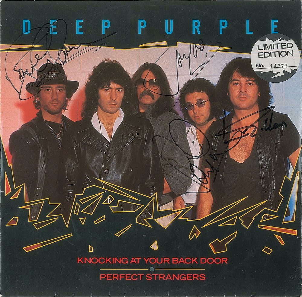 Limited edition single album for 'Knocking at Your Back Door / Perfect Strangers,' numbered 14777, signed on the front cover in black felt tip by Jon Lord, Roger Glover, Ian Paice, and Ian Gillan. In fine condition, with some creasing to edges. The record is included. Consignor notes that the signatures were obtained in person by a former tour manager.