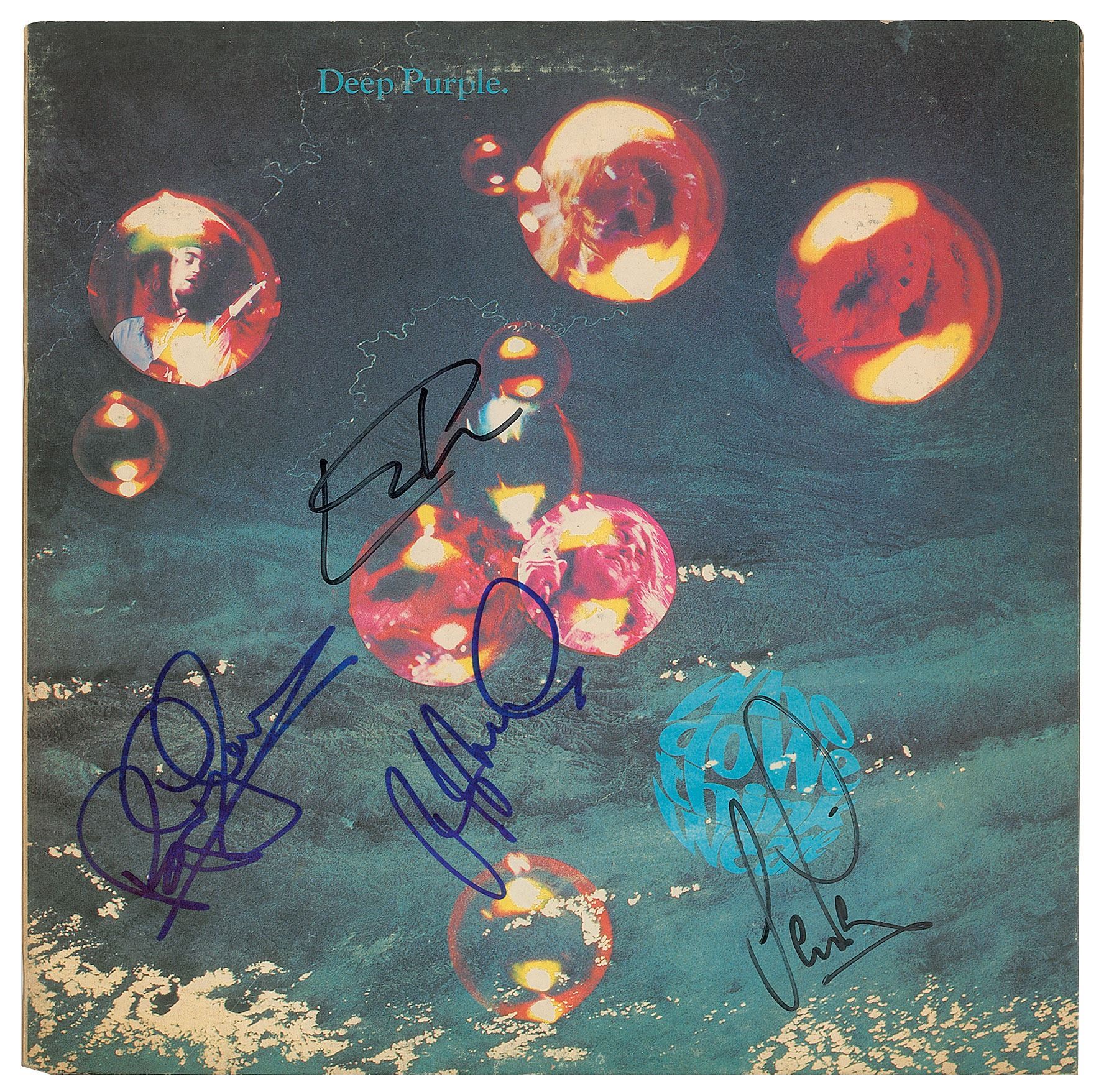 Who Do We Think We Are! album signed on the front cover in blue or black felt tip by Roger Glover, Ian Paice, Ritchie Blackmore, and Ian Gillan. In fine condition. The record is included.