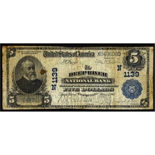 Deep River, CT. $5 1902 Plain Back. Fr. 598. The Deep River NB. Charter #(N)1139. Very Good.