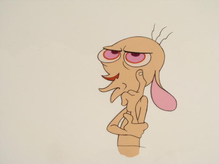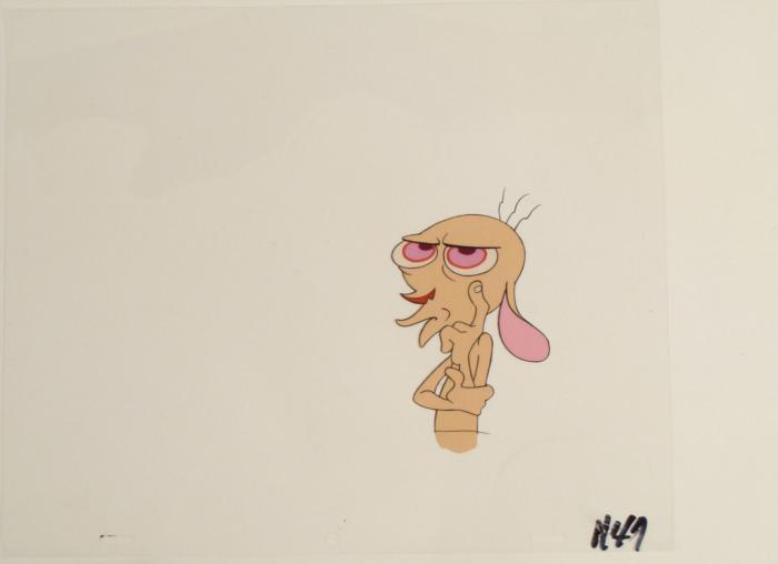 This is an original production animation cel from the Nickelodeon TV show Ren & Stimpy. The show follows two characters - Ren, a crazy Chihuahua - and - Stimpy, an incredibly stupid cat - as they think up to all kinds of hair brained schemes and get themselves into some sticky situations. The Ren and Stimpy Show debuted in August 1991 with a two-part episode, 'Stimpy's Big Day / The Big Shot' and became an instant hit. It was the third Nicktoon ever to be aired on the Network alongside Doug and Rugrats. Ren is in deep thoughtOriginal Production Art Cel Overall Size of the Cel: 10 1/2" x 1/2" Very Good condition This is an original hand-painted cel set-up used in the production of an episode of "The Ren & Stimpy Show." Each one-of-a-kind set-up represents a slight change in position of the characters. When individually photographed and projected in rapid succession, the images appear to move.
