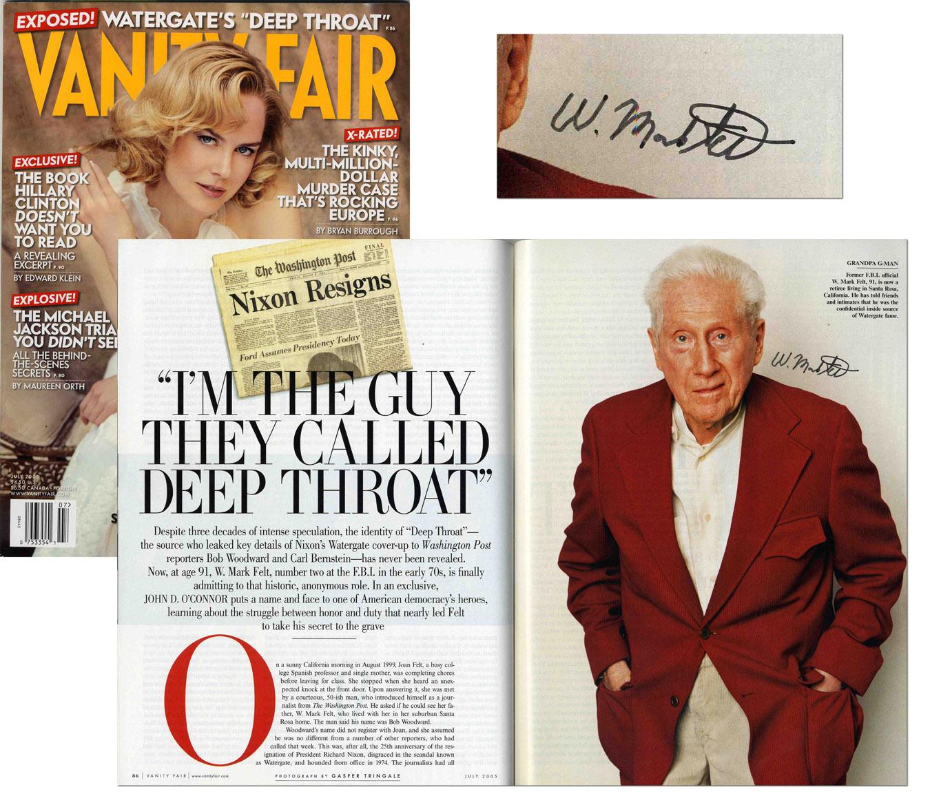 Mark Felt signed ''Vanity Fair'' article, from the famed July 2005 issue in which Felt made history, at age 91, for finally putting to rest the question that perplexed the world for three decades, with the simple but succinct title: ''I'm the guy they called Deep Throat''. Signed boldly ''W. Mark Felt'' in black felt-tip pen on a full-page color photograph of Felt which appears beside the first page of the article. Both magazine and photo page measuring 8'' x 10.75'' are in fine condition.