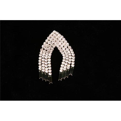 Four rows of round diamond rhinestones form a deep v with dangling ends finished with rectangular onyx rhinestones. Length: 2 1/2", Width: 1 1/4".