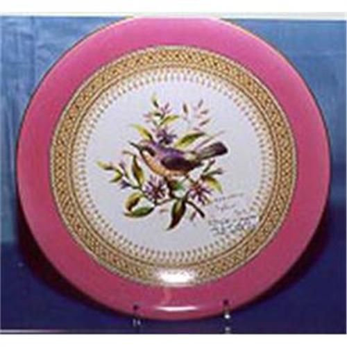 Porcelain plate with pink bank around outside edge with handpainted picture of a bird sitting on a flower branch.
