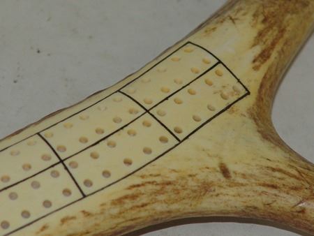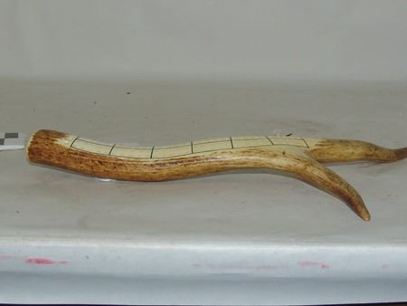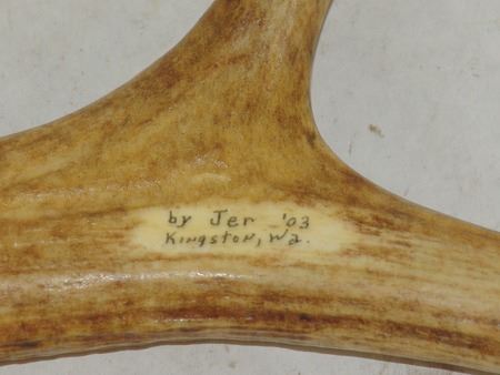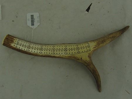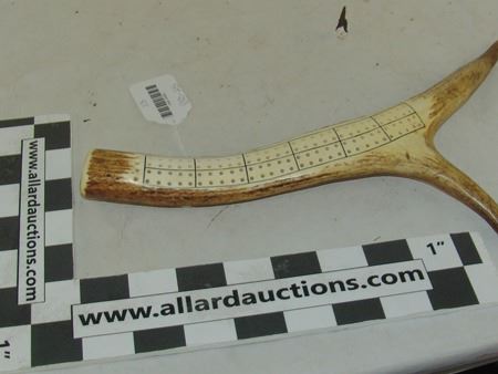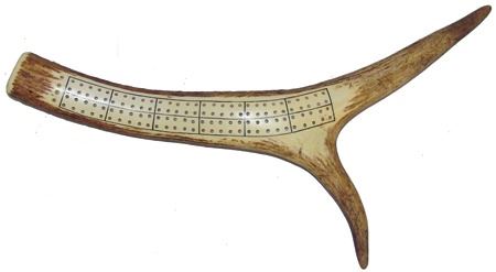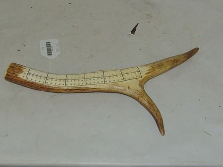 Ca. 2003, Hand carved and inked antler cribbage board from Kingston, Washington. Very good condition. 13"
