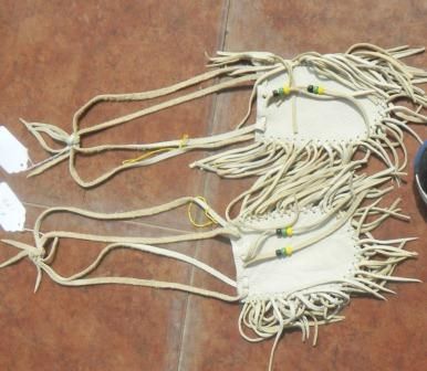 Matched pair of deer hide bags with glass beads. Over measurement with handle is 19 inches. Bag measures 6 by 4 inches. Condition as new. Shipping $12.50