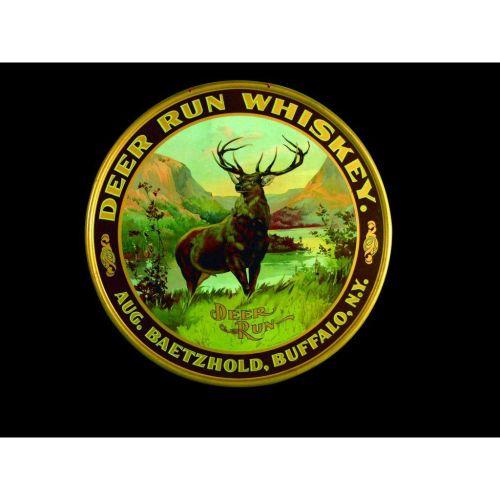 Deer Run Whiskey Self Framed Tin Sign, Aug. Baetzhold, Buffalo, NY, excellent condition, 12 inch diameter.