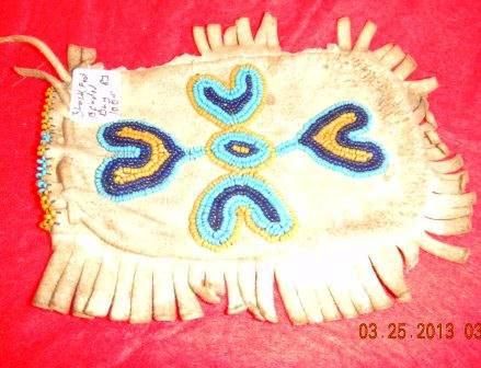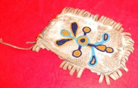 Deer hide Blackfoot Bag, measures 5 inches by 4 inches, beaded on both sides of bag, some fringe loss. Circa 1880's. Shipping $18.00