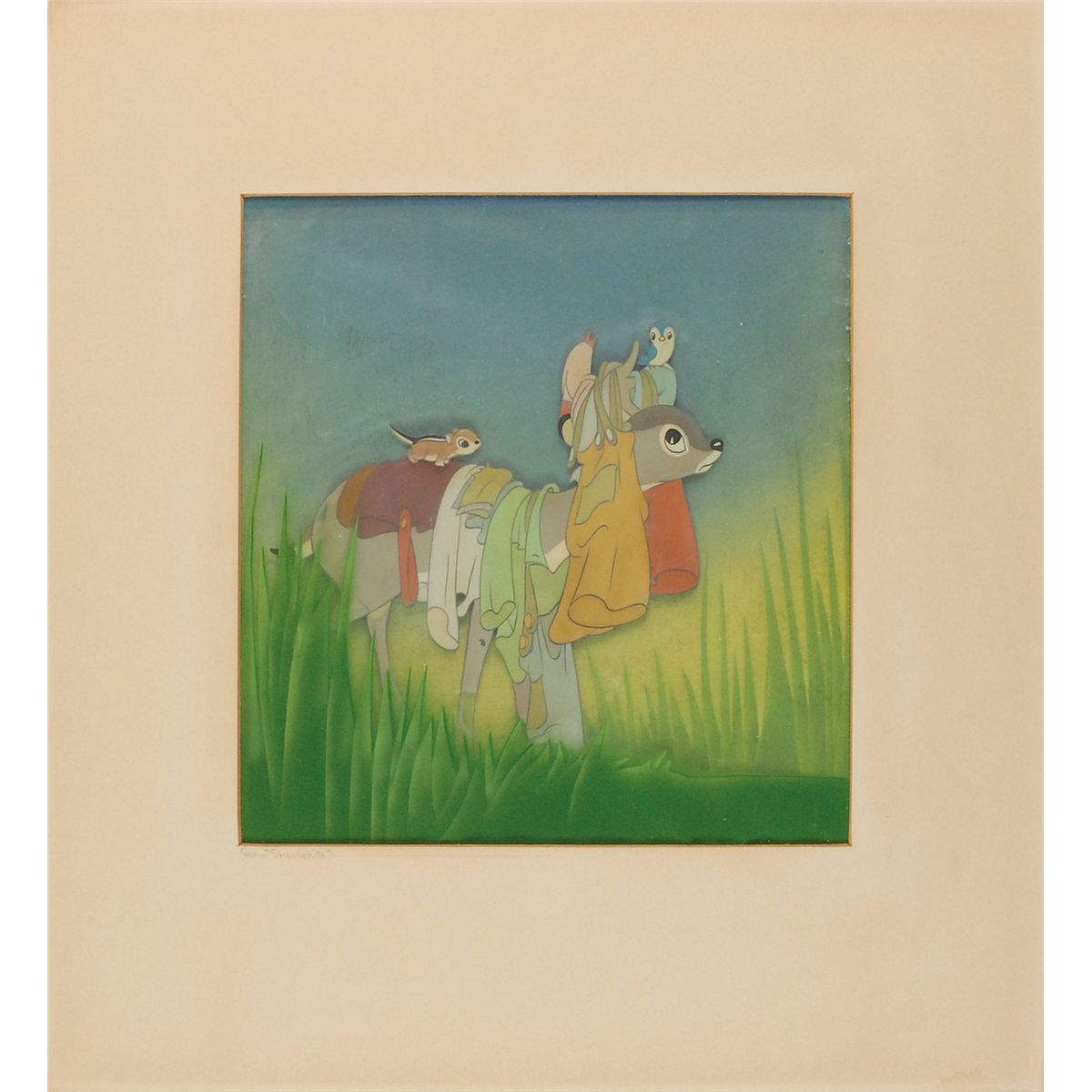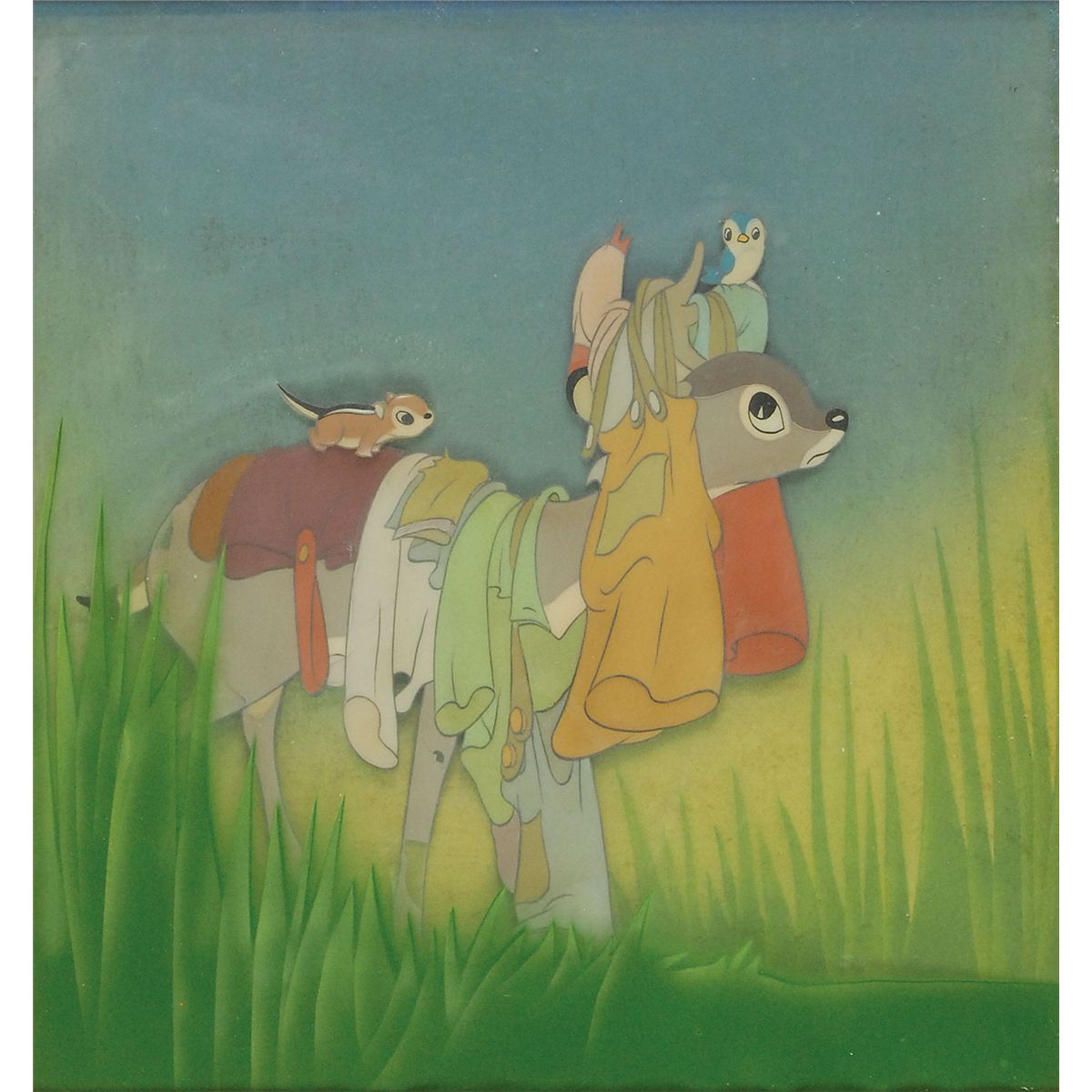 (Walt Disney Studios, 1937) Original production cel featuring a deer with animal friends from Snow White and the Seven Dwarfs, showing the young deer draped in the dwarfs’ clothing with a chipmunk on his back and a bird perched atop his antlers. The cel has been trimmed and applied to an airbrushed background as prepared by the Disney Studio to be sold at the Courvoisier Galleries. Image measures 5 x 4.75, with a mat opening of 6.75 x 7. Mat dimensions are 11 x 12. The piece has the original Disney Courvoisier Galleries label on the reverse. Mild rippling to celluloid and chipping and cracking to paint on the deer’s legs, otherwise fine condition. A nicely presented cel of Snow White’s adorable forest friends.