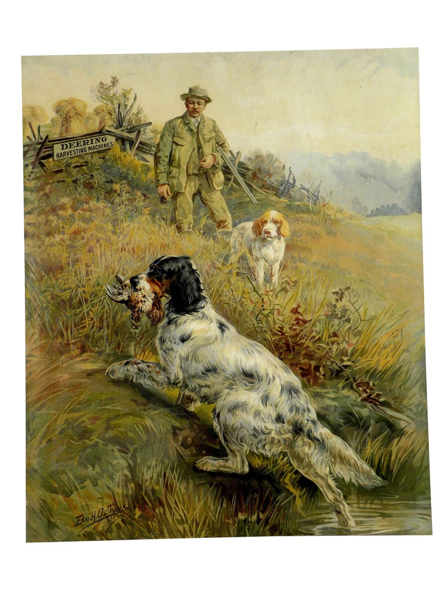 Deering Harvesting Machines Paper Sign. Edm. H. Osthaus, artist. Wrinkle at 1:00 otherwise very good condition, framed under glass. 16 X 19 inches image only.