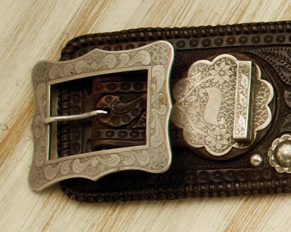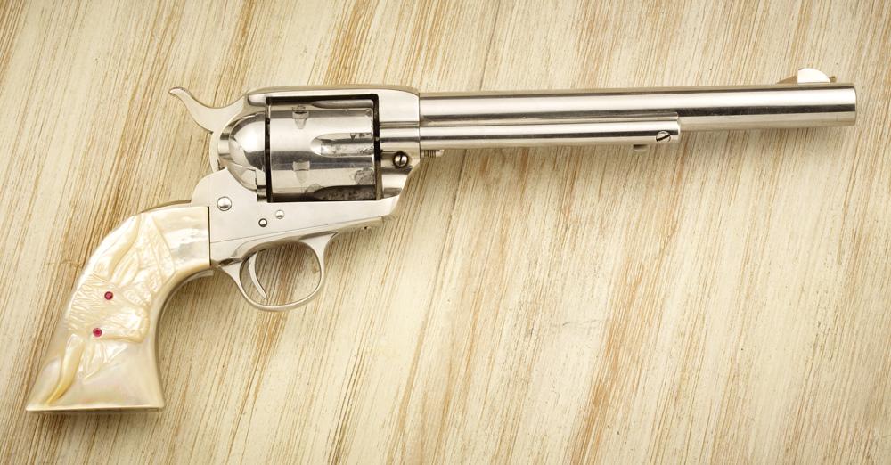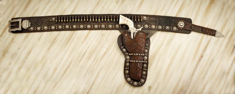 Decorative, floral carved single buscadero gun rig, perimeter laced, mounted with engraved German silver, prisonmade mountings that include a 2 1/2” x 3 1/4” rectangular buckle and keeper, 3/4” engraved scalloped conchos, silver spots, prison tip, plus a 7 1/2” Colt SA, Ser# 331667 (1915). Nickel plating is flaking in spots but remains bright. 2 pc longhorn pearl grips with ruby eyes