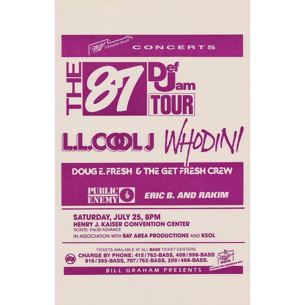 Original white-and-purple 14 x 22 concert poster for The 87 Def Jam Tour’s stop at the Henry J. Kaiser Convention Center in Oakland, California, on July 25, 1987, listing rap acts like LL Cool J, Whodini, Public Enemy, Eric B. and Rakim, and Doug E. Fresh and the Get Fresh Crew. In fine condition.