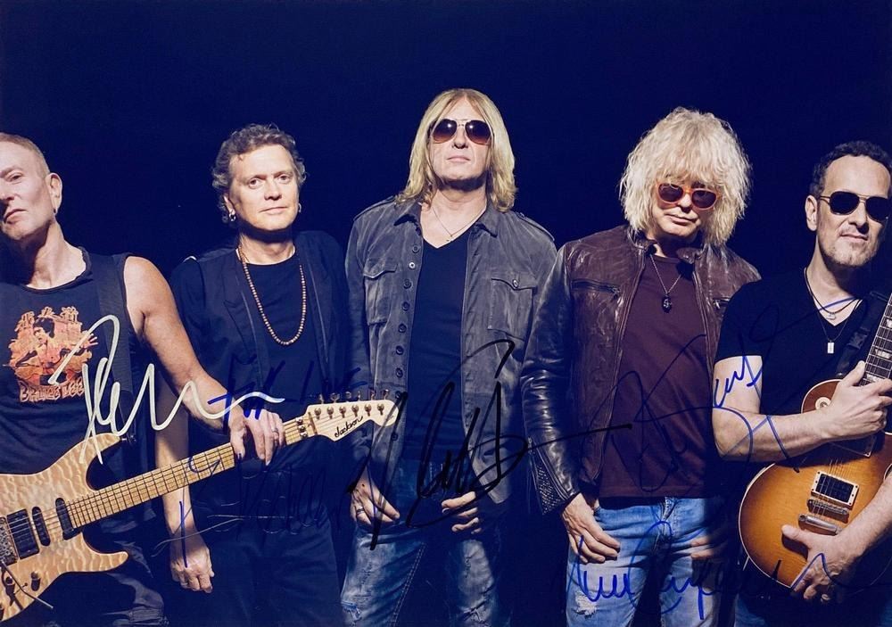 Def Leppard band facsimile facsimile signed photo autographed by Joe Elliott, Rick Savage, Rick Allen, Phil Collen and Vivian Campbell. 8x10 inches. This item is a reprint of an original autograph