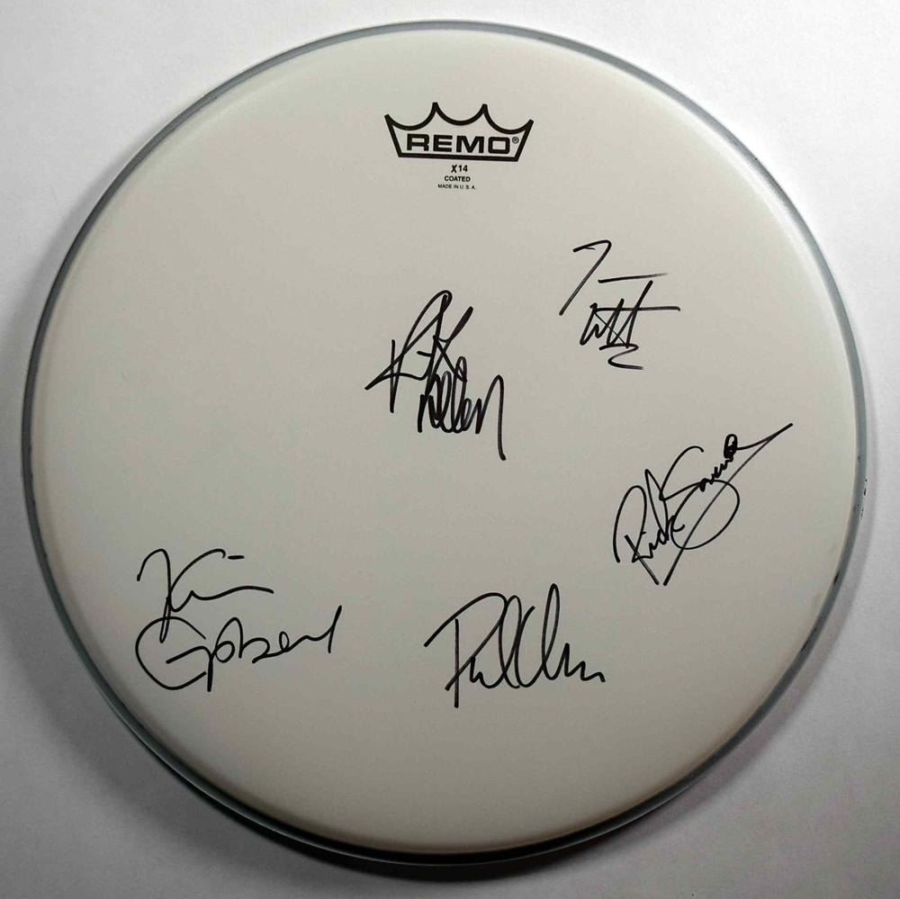 Def Leppard drum head signed: Joe Elliott, Vivian Campbell, Rick Savage, Rick Allen, and Phil Collen.