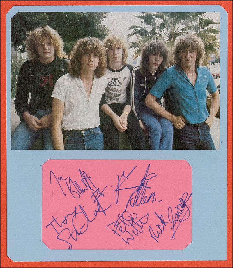 Very early in-person felt tip signatures of Steve Clark, Pete Wills, Joe Elliott, Rick Allen, and Rick Savage on a pink 5 x 3 card. Card is removably attached by its corner tabs to a larger sheet, along with a group photo, in turn removably attached to a 7.5 x 9 sheet. In fine condition.