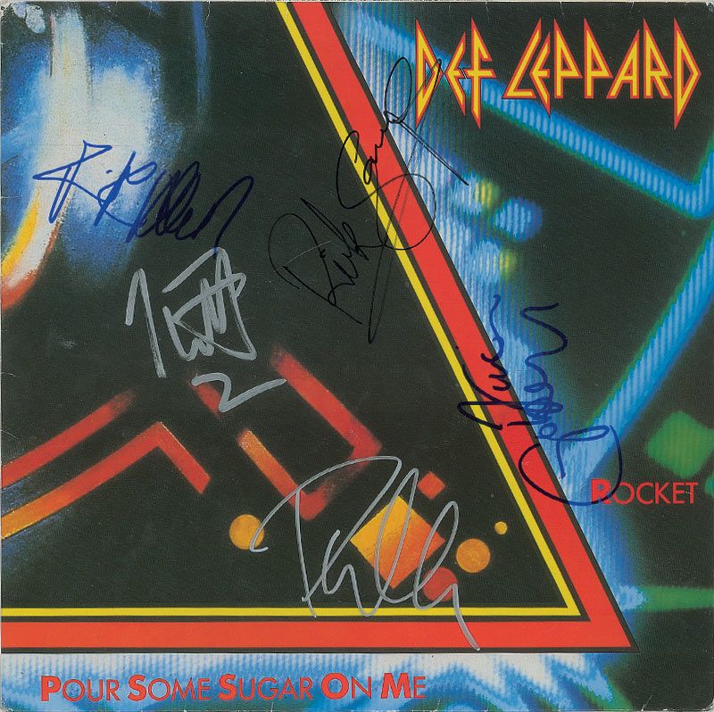 Pour Some Sugar On Me/Rocket 12? album signed on the front cover in ink and felt tip by Phil Collen, Joe Elliott, Rick Savage, Rick Allen, and Vivian Campbell. In fine condition, with some scattered edge creasing and a bit of soiling and sales label to back cover. The record is not included.