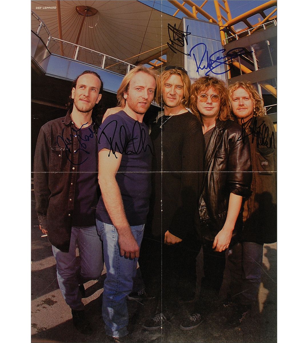 Color 14.75 x 20.75 insert poster of the band, signed in black and blue felt tip by Phil Collen, Joe Elliott, Rick Savage, Rick Allen, and Vivian Campbell. In fine condition, with central horizontal and vertical folds, and four sets of staple holes to the vertical fold.