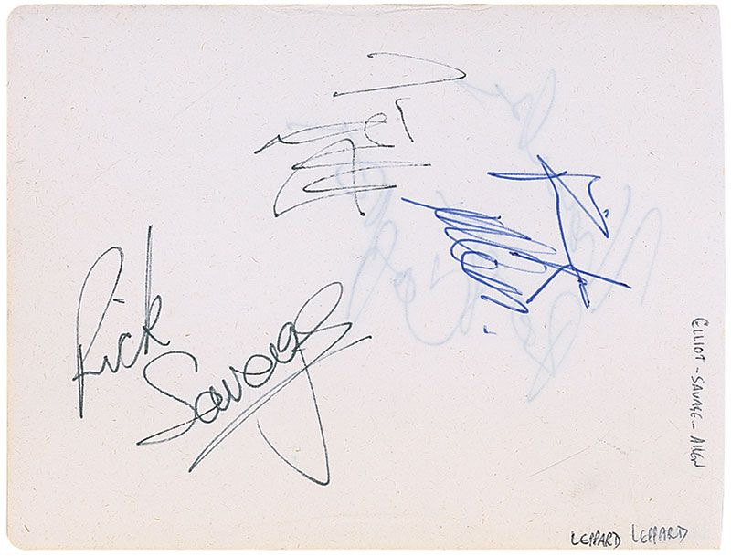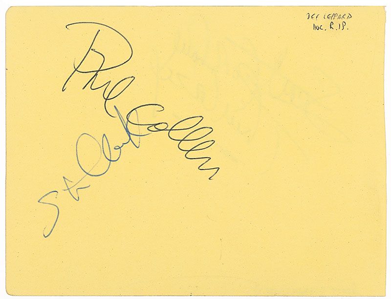 Ballpoint signatures of Joe Elliott, Rick Savage, and Rick Allen on an off-white 4 x 5.25 album page; and ballpoint signatures of Phil Collin and Steve Clark on a yellow 5.25 x 4 album page. In overall fine condition, with some show-through from signatures to reverse (Scott Gorham and Roger Capps). Accompanied by a full letter of authenticity from Roger Epperson/REAL.