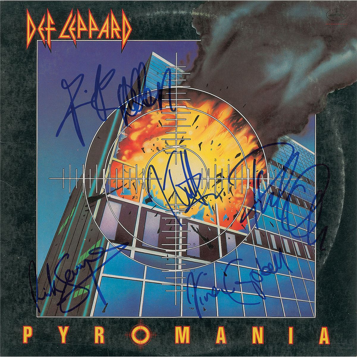Pyromania album signed on the front cover in blue felt tip by Phil Collen, Joe Elliot, Rick Savage, Rick Allen, and Vivian Campbell. In fine condition, with a ‘ring of wear’ to the front cover. The record is not included.