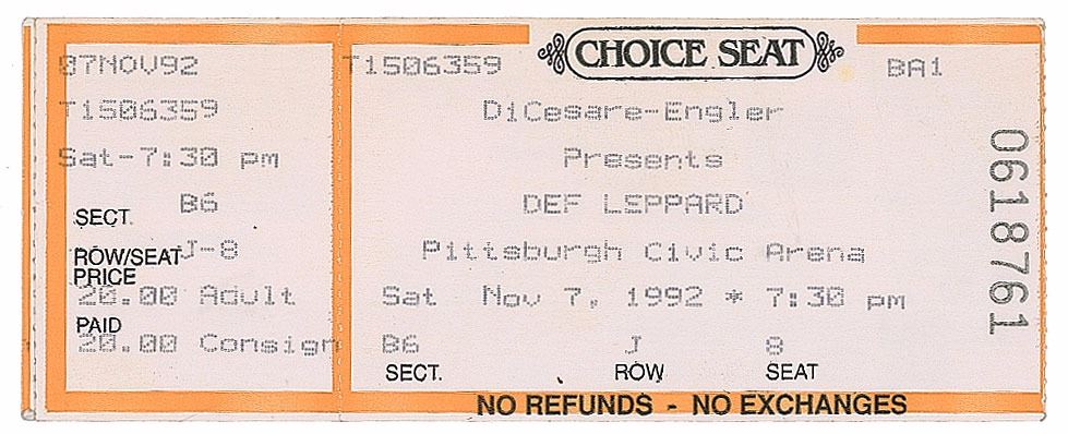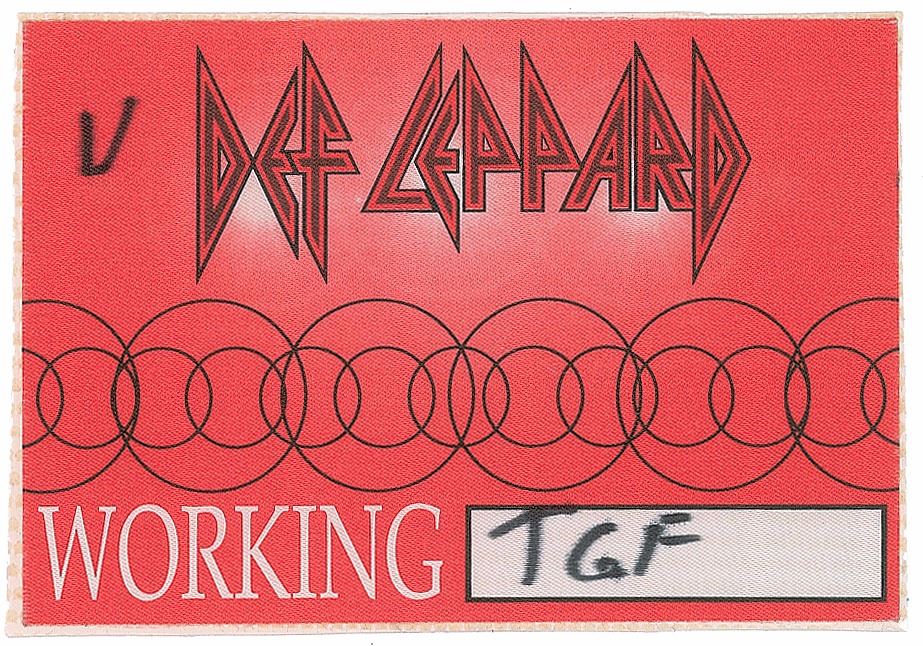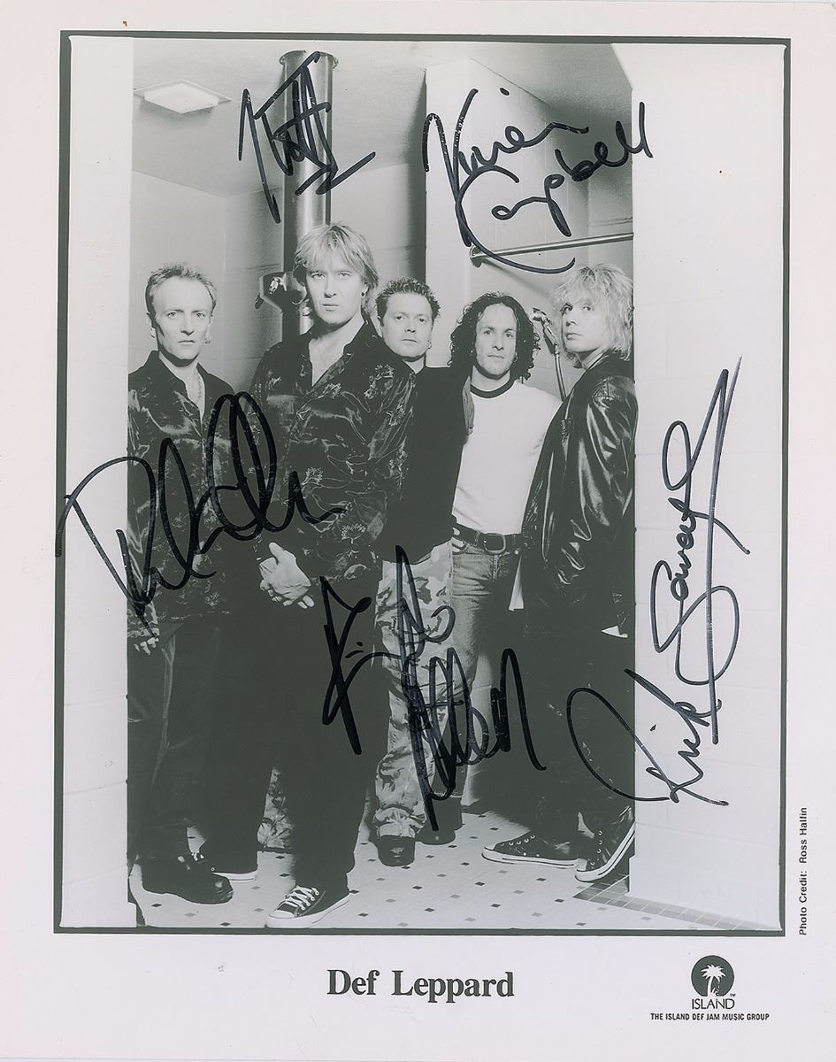 Satin-finish 8 x 10 Island Records publicity photo, signed in black felt tip by Rick Savage, Phil Collen, Joe Elliot, Rick Allen, and Vivian Campbell. In fine condition, with a slight bend to the upper right corner and trivial irregular ink adhesion. Accompanied by an 1992 ticket stub and backstage crew pass.