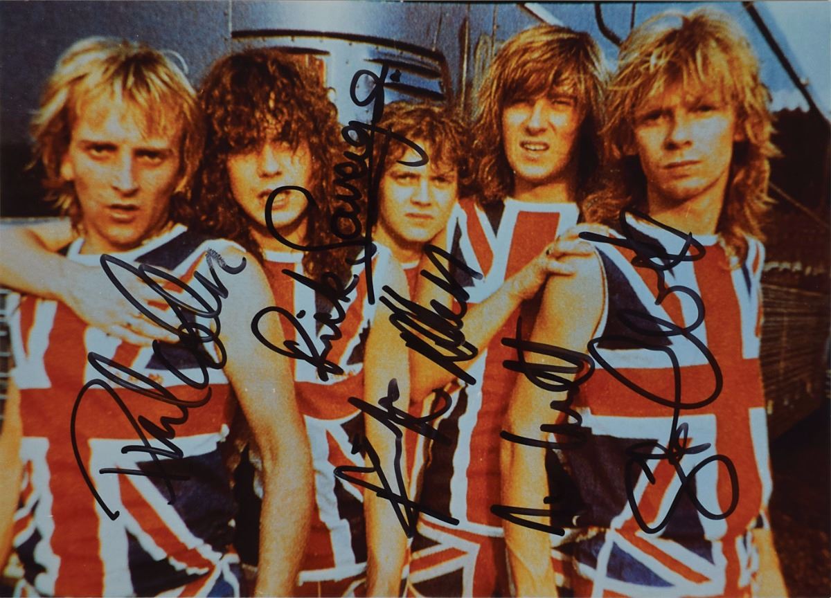 Color glossy 7 x 5 photo of the band circa 1983, signed in black felt tip by Joe Elliott, Steve Clark, Rick Savage, Rick Allen, and Phil Collen. In fine condition. A desirable example featuring Def Leppard's most desirable lineup including Steve Clark, who tragically passed away in 1991 at age 30 due to alcohol poisoning. Pre-certified REAL.