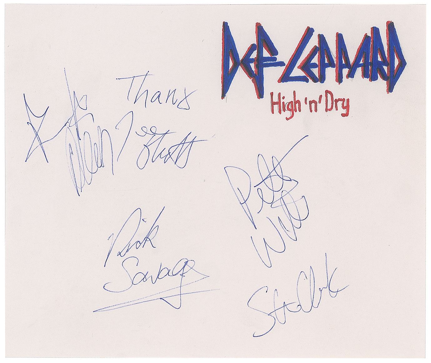 Vintage ballpoint signatures from 1981, "Thanx, Joe Elliott," "Rick Allen," "Rick Savage," "Steve Clark," and "Pete Willis," on an off-white 7.75 x 6.5 sheet, with another hand adding the band's logo and the title of their second album in colored felt tip. In fine condition. The consignor notes that these signatures were acquired on September 30, 1981, at Record Revolution's High 'n' Dry album party in Parma, Ohio; the band was playing the Music Hall in Cleveland as an opening act for Black Foot that evening. A desirable vintage set of signatures featuring the band's original guitarists, the late Steve Clark and Pete Willis.