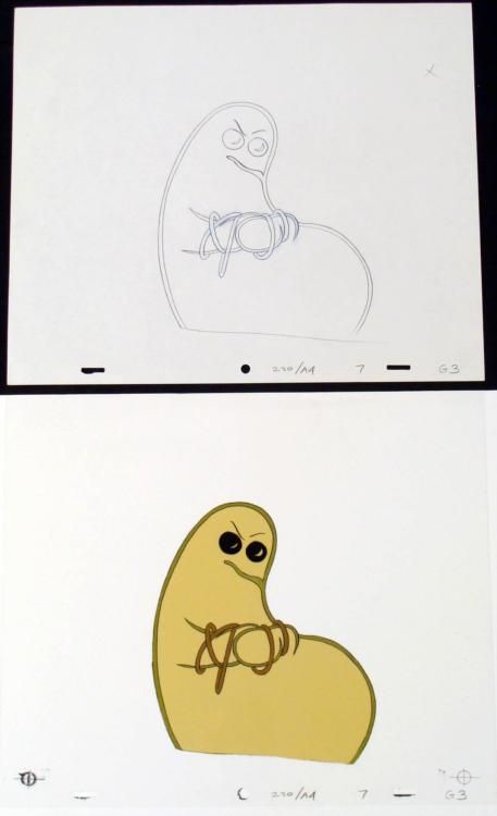 Only ropes can defeat Gloop * * * Original Animation Cel & DrawingMedium: Hand painted acetate celDetails: Animation notations and peg holes * * Original "rough" animation drawing, in non-photo blue and black pencil * * Size of cel: 10 1/2 x 12 1/2 inchesSize of drawing: 10 1/2 x 12 1/2 inches * * Condition: Very good * This is an original hand-painted cel set-up used in the production of the "The Herculoids." Each one-of-a-kind set-up represents a slight change in position of the characters. When individually photographed and projected in rapid succession, the images appear * to move. To created production cels, the original animator's drawing is transferred onto an acetate cel (by hand-inking and/or photo copying). The cel is then hand-painted on the reverse side. * * * * * Traditional animation is a multi-step process which includes various types of art techniques. Drawings are a key part of the process, in which the animator creates the design and movement of the characters. Drawings are then transferred onto acetate cels (by * hand-inking and/or photo copying) to create a production cel, which is then hand painted on the back side, using paint colors chosen and approved by the creator of the series.