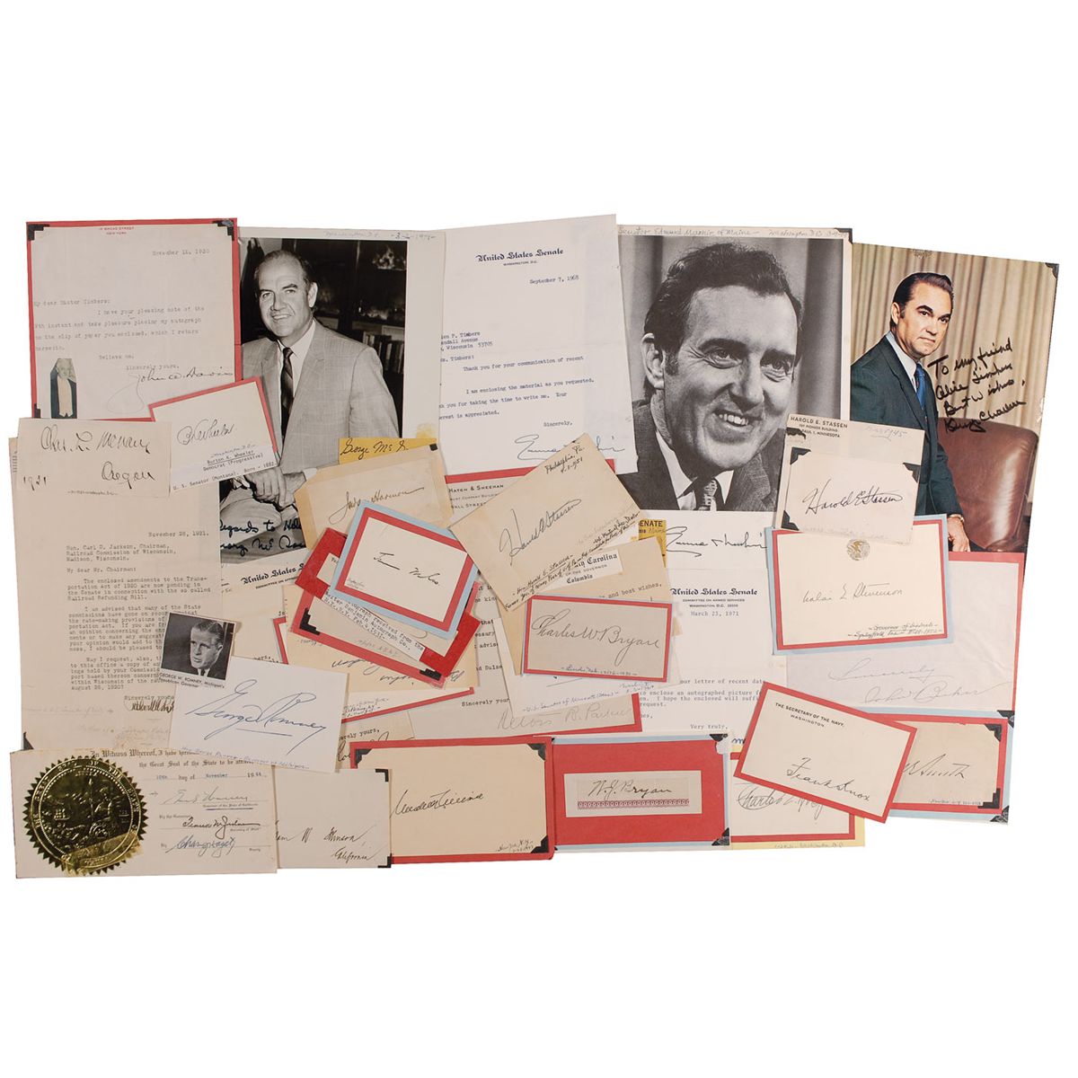 Thirty-six items consisting of vintage signatures on various size cards and slips, signed photos, and letters, each signed by a different former presidential candidate. Signers are: William Jennings Bryant, David B. Hill, Thomas Reed, Alton Parker, Hiram Johnson, Nicholas Murray Butler, Judson Harmon, James Cox, Charles Evans Hughes, Robert La Follette, Charles Bryan, Joseph Robinson, John Davis, Burton Wheeler, Alfred Smith, Norman Thomas, Frank Knox, Alf Landon, Charles McNary, Robert Taft, Wendell Willkie, Thomas Dewey, George Wallace, Edmund Muskie, Harold Stassen, Richard Russell, George Romney, John Bricker, Earl Warren, Strom Thurmond, John Sparkman, Adlai Stevenson, George McGovern, Barry Goldwater, Eugene McCarthy, and Andrew Johnson (1959). In very good condition, with various scattered toning, trimmed edges, folds, and mounting remnants to some of the corners.