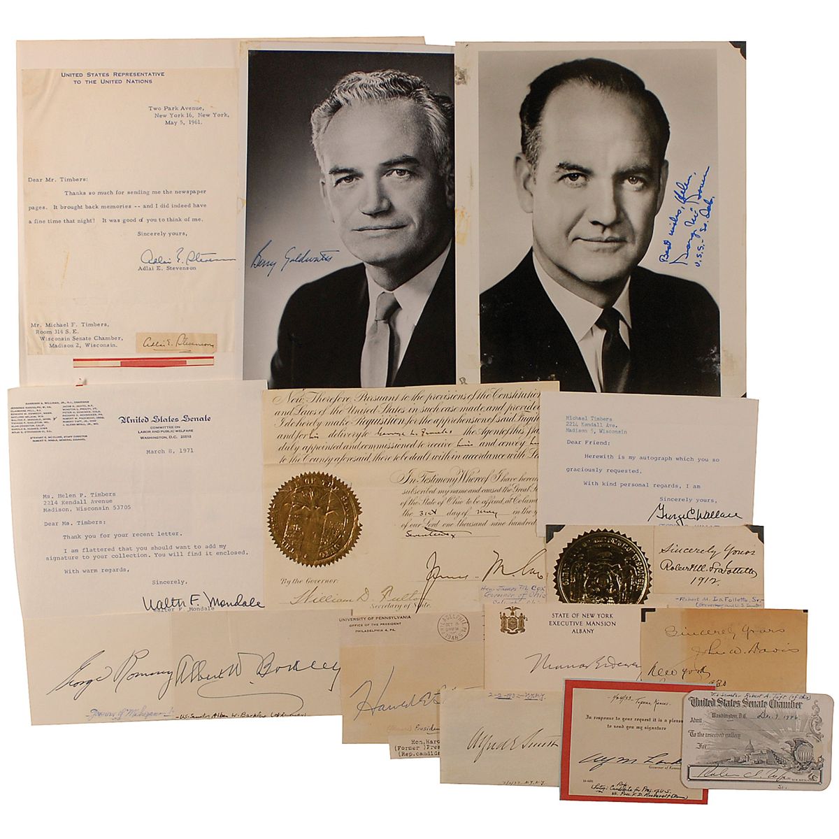 Fifteen items consisting of signatures, brief ALSs and TLSs, on various size slips, cards, sheets, and photos, each signed by a different defeated candidate. Signers are: Robert La Follette, Alfred Smith, James Cox, Alf Landon, Harold Stassen, Robert Taft, George Wallace, George Romney, Thomas Dewey, Adlai Stevenson, George McGovern, Barry Goldwater, Alben Barkley, Walter Mondale, and John Davis. In very good condition, with various scattered toning, folds and trimmed edges to letters, mounting remnants to many of the corners, and the Stevenson letter affixed to a large scrapbook page.