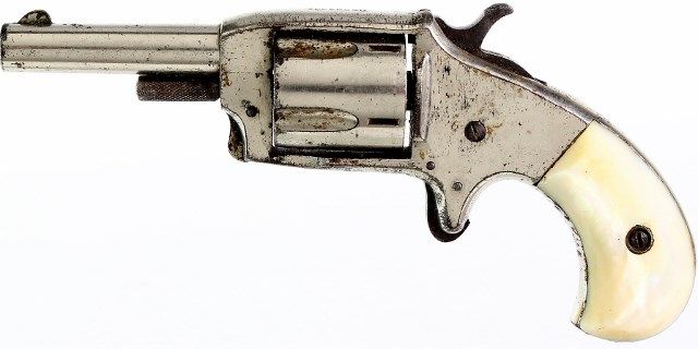 with 2 1/2" round barrel, original nickel finish, nice fitting pearl grips. Good firm action with poor bore. Antique. Est. 200-300