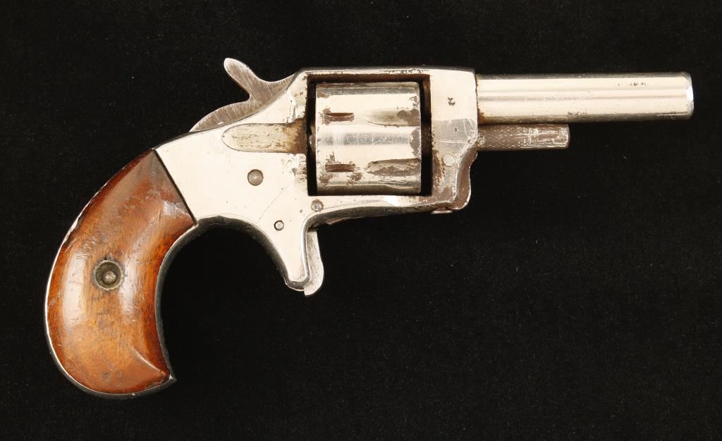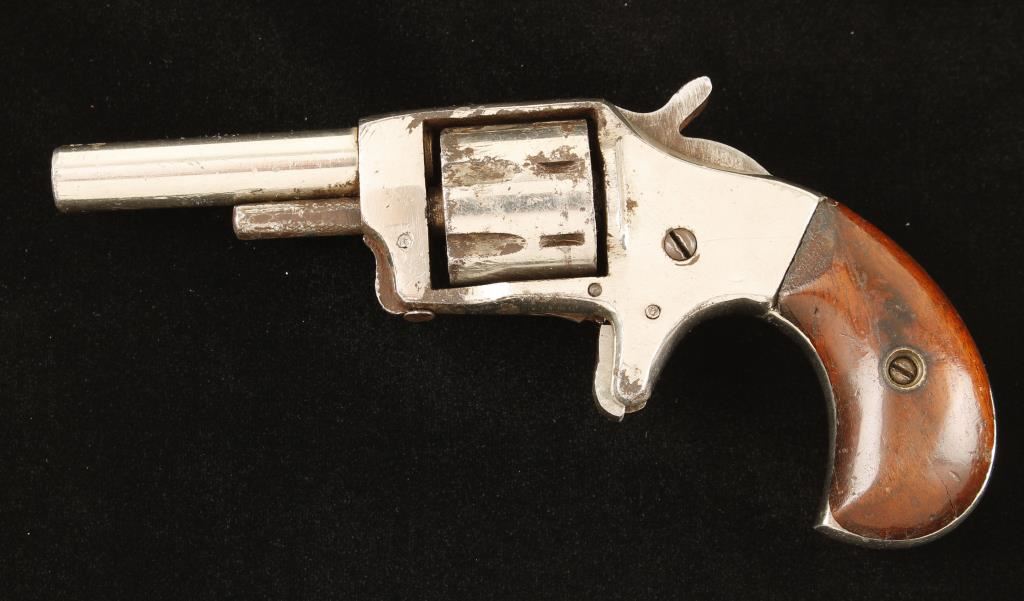 Nickel plated 7 shot spur trigger revolver. Features 2.25" barrel with wood grips and is missing front sight. 80% nickel remaining, action does not function properly. Overall condition is fair. *Antique Firearm*