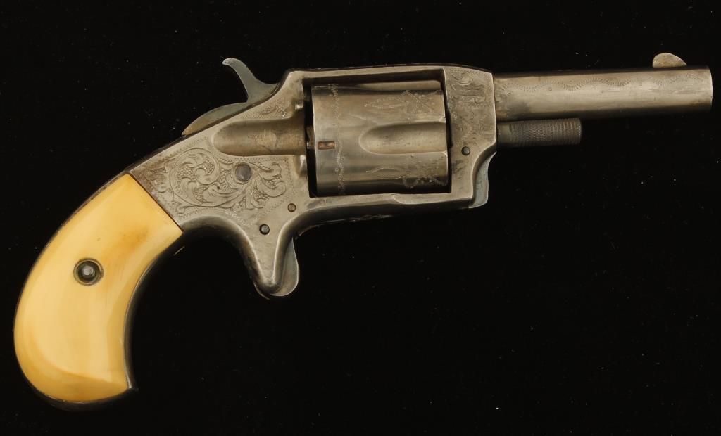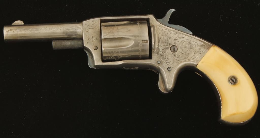 Single action spur trigger 5 shot revolver with 2-1/2" round barrel. Scroll and decorative engraving, bright blue hammer, ivory birdshead grips and fixed sights. Very good working action. Trigger is very light. Condition: Very good with no loss to grips. *Antique Firearm*